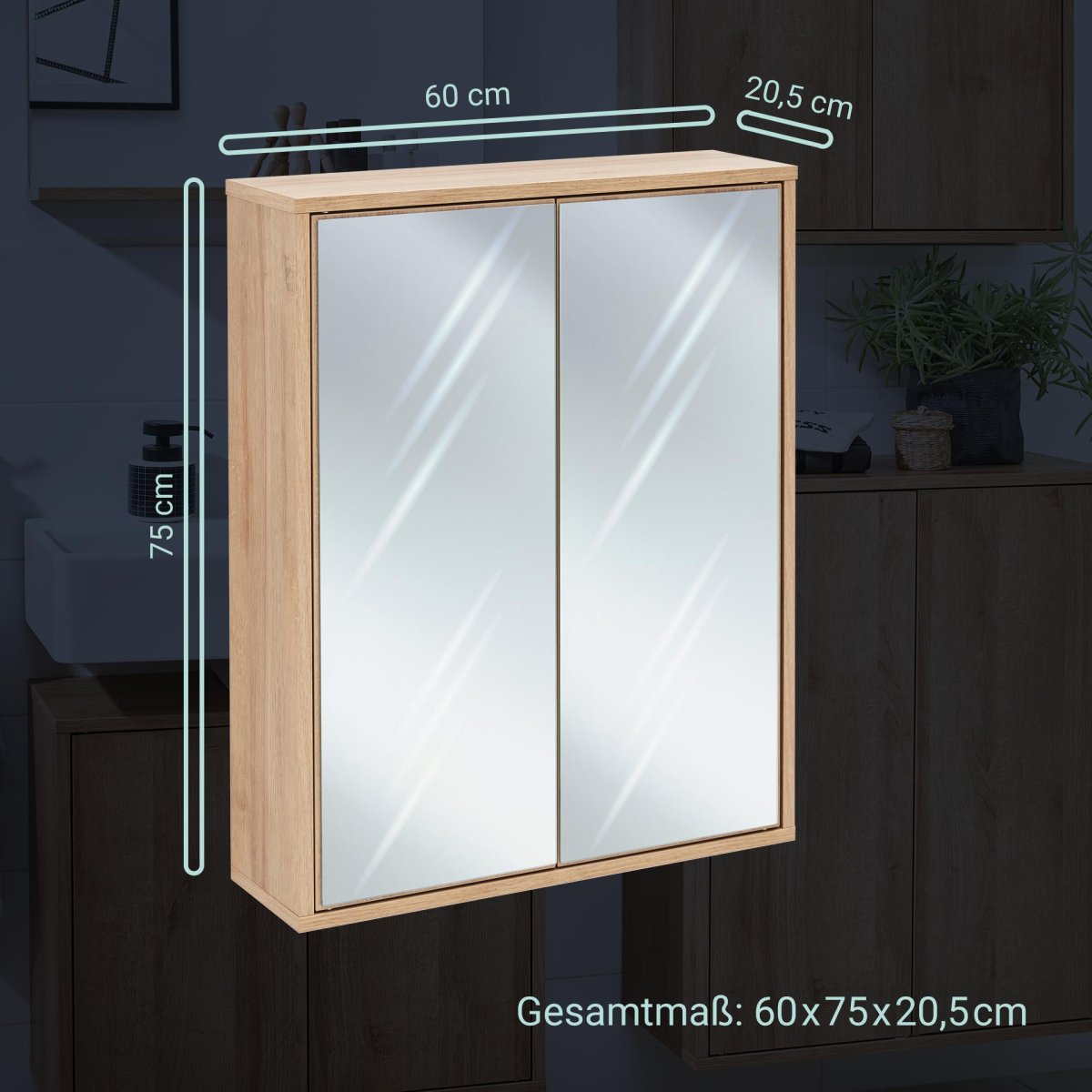 - Maße: 60 cm Breite, 75 cm Höhe und 20,5 cm Tiefe