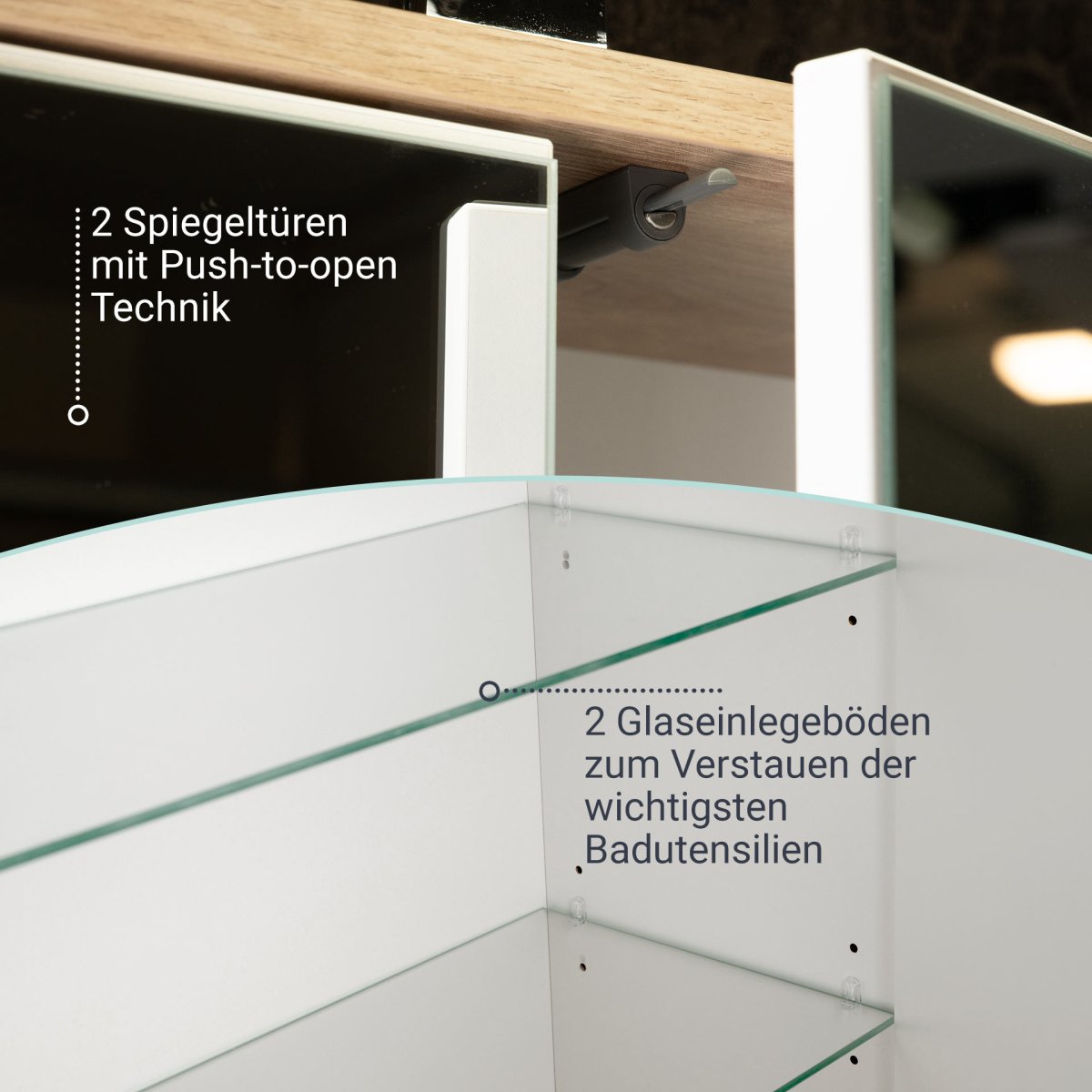 Der Spiegelschrank FINN im Retrostil von Fackelmann überzeugt durch die innovative Push-to-open Technik: Einfach auf die Front des Spiegels drücken und die Tür öffnet sich sanft. Die rechten und linken Seitenteile in mattem Weiß und das umlaufende Rahmendekor in Hellbraun kennzeichnen dieses Badmöbel. Der Fackelmann FINN Spiegelschrank 60 cm, Braun hell/Weiß wird zerlegt und mit einer leicht verständlichen Aufbauanleitung geliefert. Um die Spiegelfläche optimal zu beleuchten, hast Du zwei LED-Aufsatzleuchten zur Auswahl: Diese sind 20 cm (Art.nr. 84372) oder 30 cm (Art.nr. 84373) breit. Mit der E-Box (Art.nr. 84378) kannst Du elektrische Geräte direkt am Fackelmann FINN Spiegelschrank 60 cm, Braun hell/Weiß nutzen. Über den integrierten Schalter lässt sich auch die Beleuchtung steuern. Leuchten und E-Box sind nicht im Lieferumfang enthalten und separat hier im Shop erhältlich.