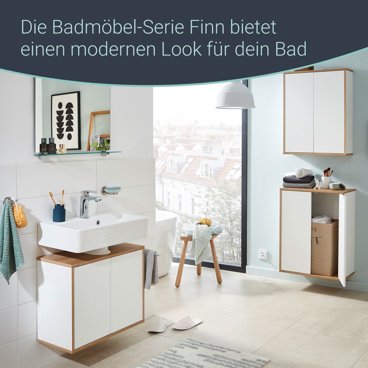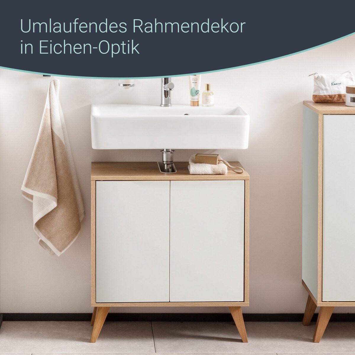 Ein echter Blickfang im Bad ist der Waschbeckenunterschrank FINN im Retrostil mit einer Front in mattem Weiß. Durch das umlaufende Rahmendekor in Eichen-Optik kommt die helle Front optimal zur Geltung. Dank 60 cm Breite eignet sich der Schrank auch für kleine Bäder und Gäste-WCs. Seine zwei Türen lassen sich durch leichtes Antippen mit der Push-to-open Technik einfach öffnen und schließen. Dazu passen die Keramik-Waschbecken (Art.Nr. 86281 und 82450) aus der Serie FINN von Fackelmann. Mit den vier schrägen Holzfüßen aus massivem Eichenholz (Art.Nr. 84600) wird aus dem hängenden Badmöbel ganz leicht ein stehendes im modernen Skandinavien-Design. Holzfüße und Becken sind nicht im Lieferumfang enthalten und separat hier im Shop bestellbar. Der Fackelmann FINN Waschbeckenunterschrank 60 cm, Braun hell/Weiß wird zerlegt und mit einer leicht verständlichen Aufbauanleitung geliefert.