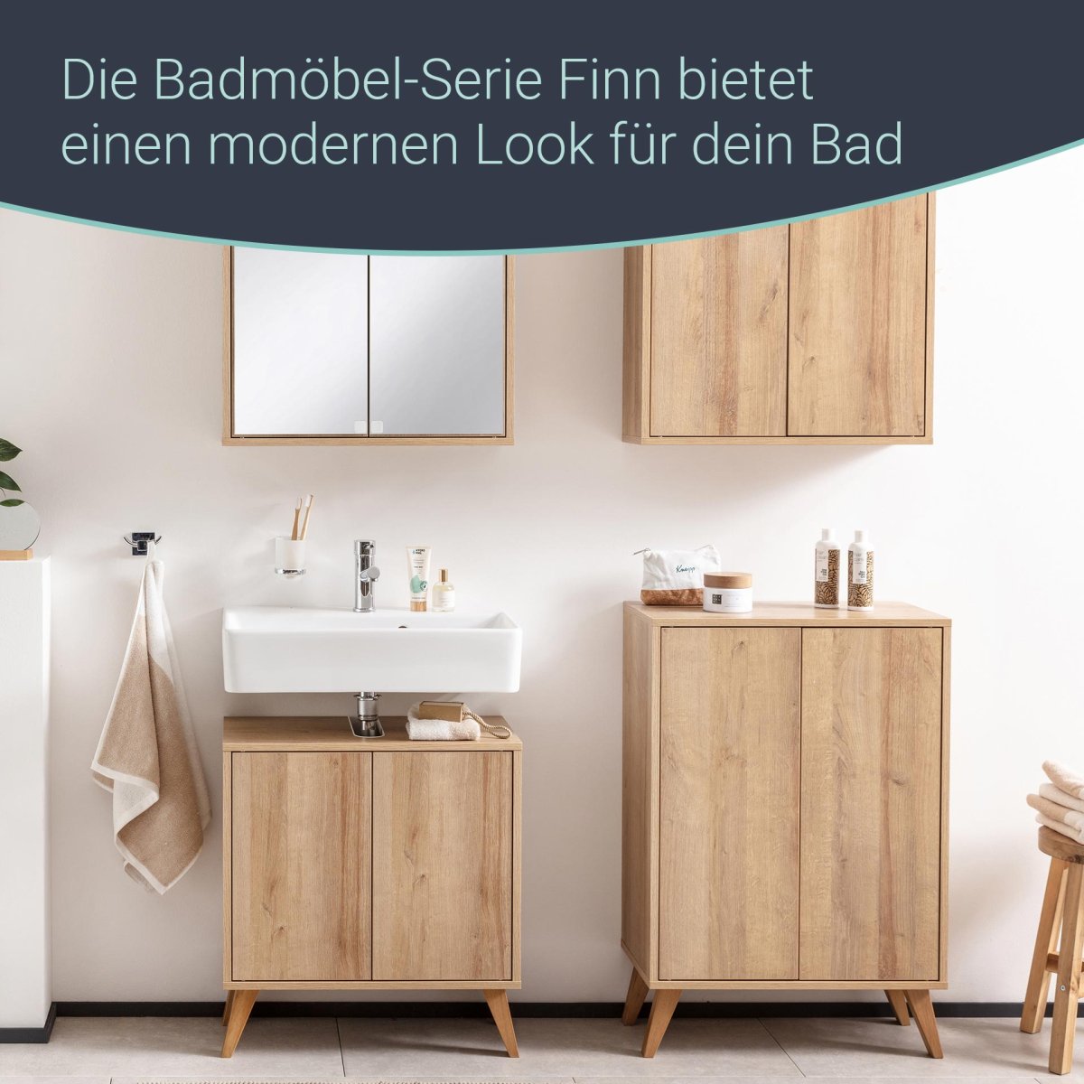 Der Waschbeckenunterschrank FINN im Retrostil eignet sich perfekt für kleine Bäder und Gäste-WCs. Seine zwei Türen lassen sich durch leichtes Antippen mit der Push-to-open Technik einfach öffnen und schließen. Front und Korpus sind in einem hellen Braun gehalten, das der natürlichen Farbe von Eiche nachempfunden ist. Die vier schrägen Holzfüße geben dem Badmöbel zudem ein modernes skandinavisches Design. Dazu passen die Keramik-Waschbecken (Art.nr. 86281 und 82450) aus der Serie FINN von Fackelmann. Der Fackelmann FINN Waschbeckenunterschrank 60 cm breit mit Füßen, Braun hell wird zerlegt und mit einer leicht verständlichen Aufbauanleitung geliefert. Die Waschbecken sind nicht im Lieferumfang enthalten und separat hier im Shop bestellbar.