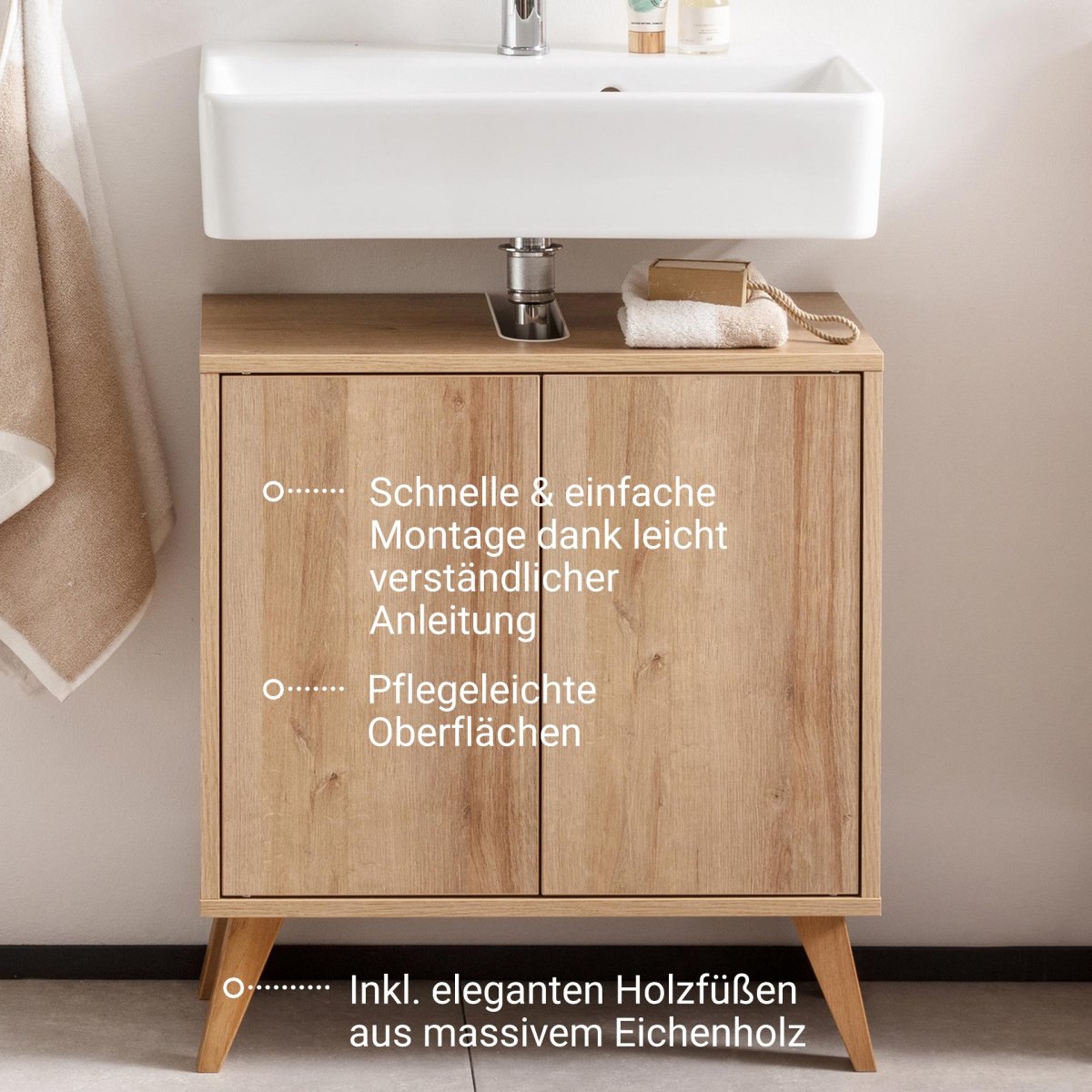 Fackelmann FINN Waschbeckenunterschrank 60 cm breit, Braun hell + Holzfüße