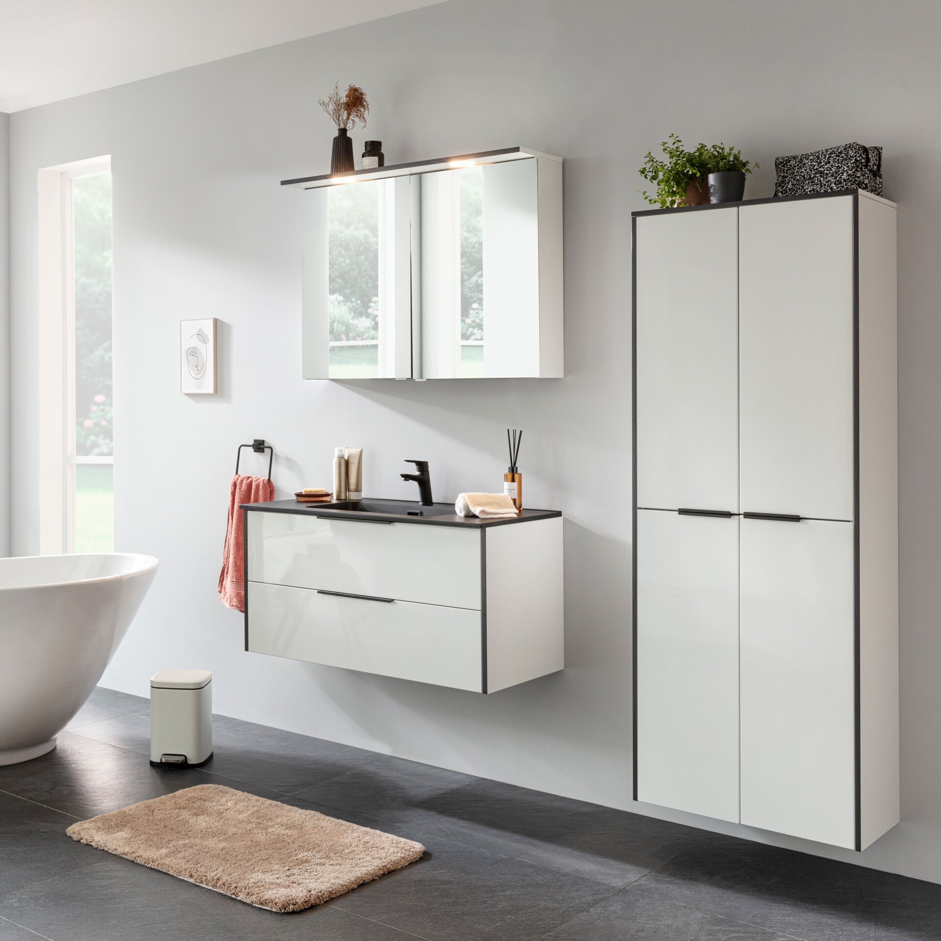 - Farbe/Design: Front - Weiß Hochglanz, Korpus - Weiß matt, Dekorkante Anthrazit, Rückwand und Querteil silberfarben