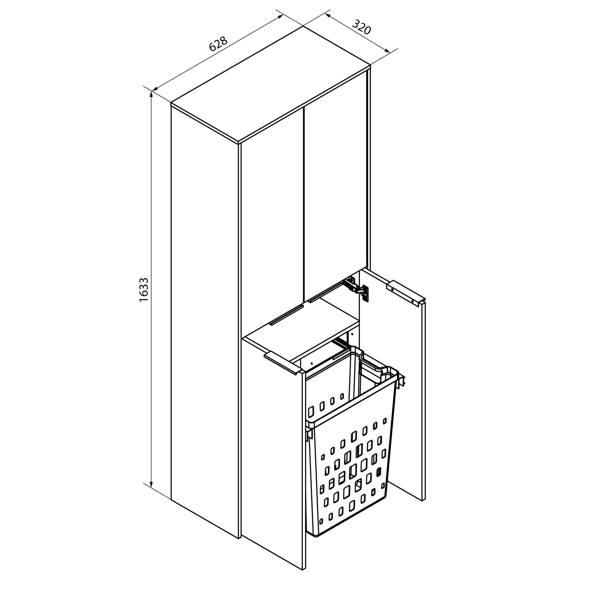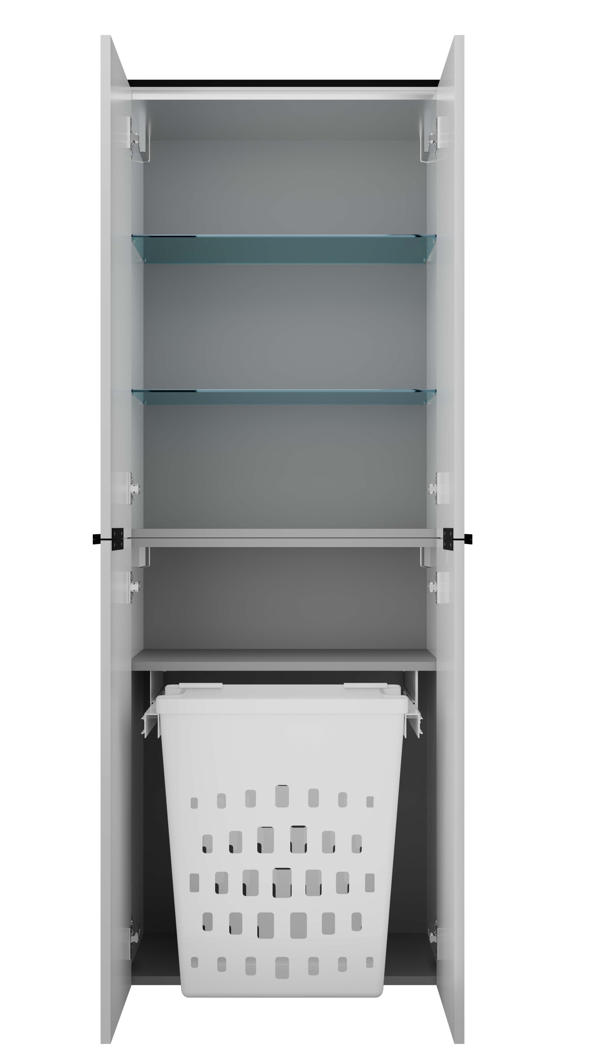 - Besonderheit: Wäschekorb mit Auszug, gedämpfte Scharniere, Griffleiste aus Metall, Korpus wird in 2 Teilen geliefert
