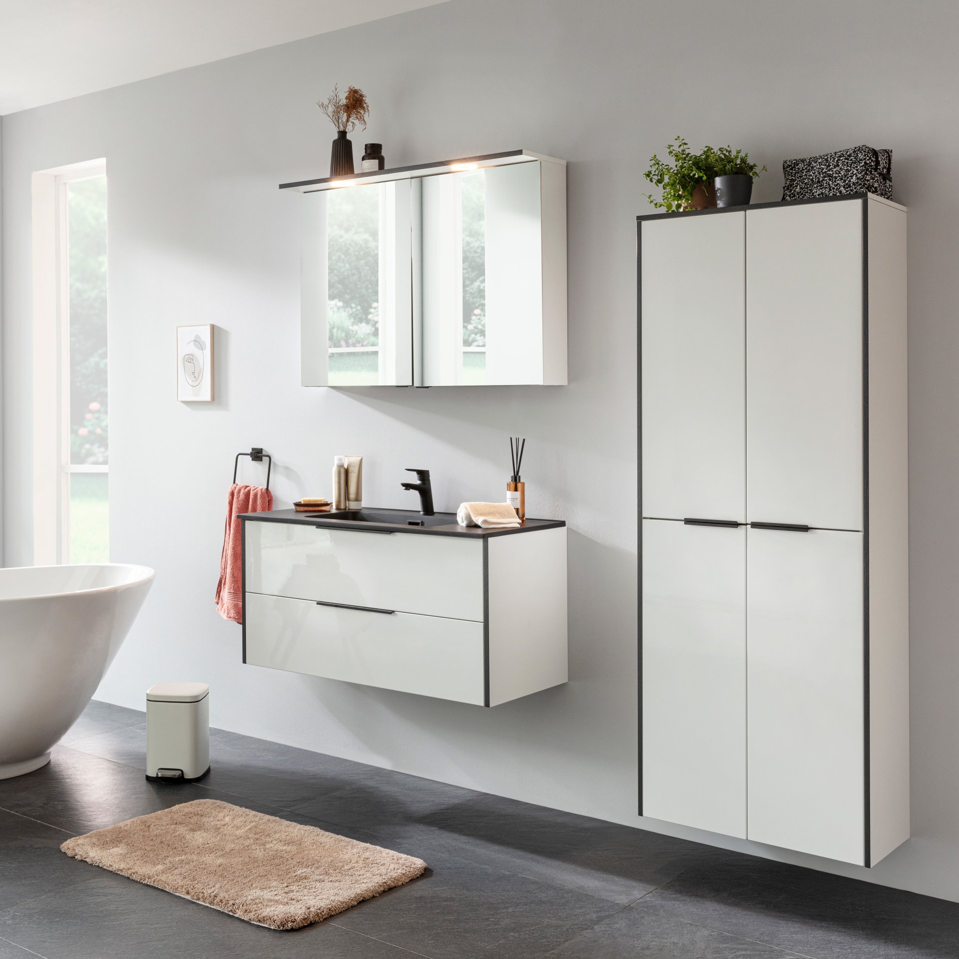 Mit dem Doppelhochschrank aus der Serie FLAIR von Fackelmann zieht ein Stauraumwunder in großzügiger Eleganz und durchdachter Funktionalität in Dein Badezimmer ein. Der 63 cm breite und 164 cm hohe Badschrank ist der ideale Helfer, wenn es um Ordnung in Familienbädern oder großzügigen Badlandschaften geht. Die Kombination aus verschiedenen Weißtönen in matt und glänzend, in Verbindung mit der Dekorkante in Anthrazit, sorgt für einen modernen, klaren Look. Hinter den vier sanft schließenden Türen warten hochwertige Glaseinlegeböden darauf, Handtücher und Badaccessoires ordentlich aufzunehmen. Besonders clever ist der integrierte Wäschekorb mit Auszug. Schmutzige Wäsche ist schnell, diskret verstaut. In der Mitte des vormontierten Schrankes setzen die schwarzen Metallgriffe auf der weißen Front charmante Akzente. Durch die ruhige, harmonische Linienführung ist der FACKELMANN FLAIR Doppel Hochschrank 63 cm breit, Weiß/Anthrazit mit Wäschekorb eine Bereicherung und Blickfang für edle Bäder. Badmöbel von Fackelmann werden mit viel Liebe zum Detail in Deutschland hergestellt und zeichnen sich durch ihre bekannte Qualität aus.