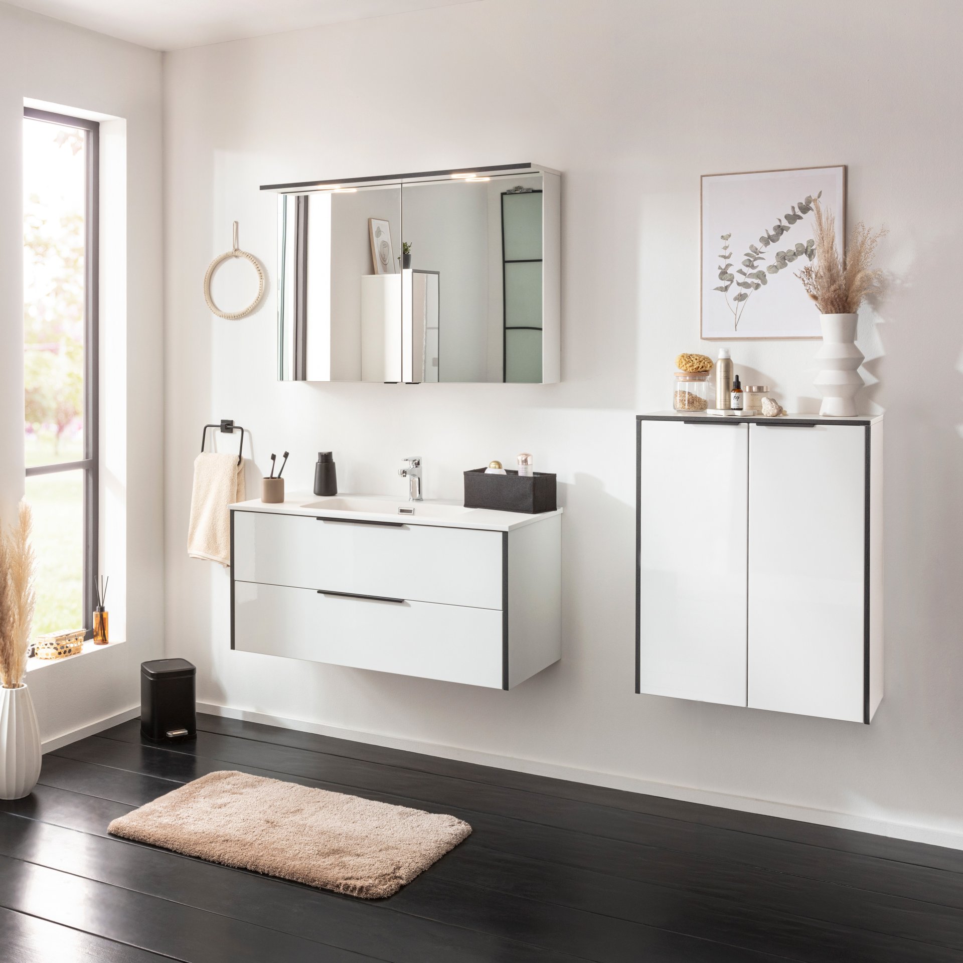 Du suchst nach einem großzügigen Schrank in luxuriösem Design, der mit durchdachter Funktionalität punktet? Dann ist der 63 cm breite Doppelmidischrank aus der Serie FLAIR von Fackelmann genau das Richtige für Dich. Das neue Schmuckstück in Deinem Bad sorgt für Ordnung und Deine Lieblingssachen erhalten einen ordentlichen Platz. Hinter zwei Türen mit moderner Soft-Close-Funktion verbirgt sich ein praktischer Stauraum mit einem Einlegeboden. Besonders clever ist der integrierte Wäschekorb mit Auszug. Schmutzige Wäsche ist schnell, diskret verstaut. Die weiße Hochglanzfront verbunden mit einer schmalen Kante in Anthrazit verleihen dem Schrank seine luxuriöse Ausstrahlung. Der FACKELMANN FLAIR Doppel Midischrank 63 cm breit, Weiß/Anthrazit mit Wäschekorb wird vormontiert geliefert und ist damit schnell in Deinem modernen Bad integriert. Badmöbel von Fackelmann werden mit viel Liebe zum Detail in Deutschland hergestellt und zeichnen sich durch ihre bekannte Qualität aus.