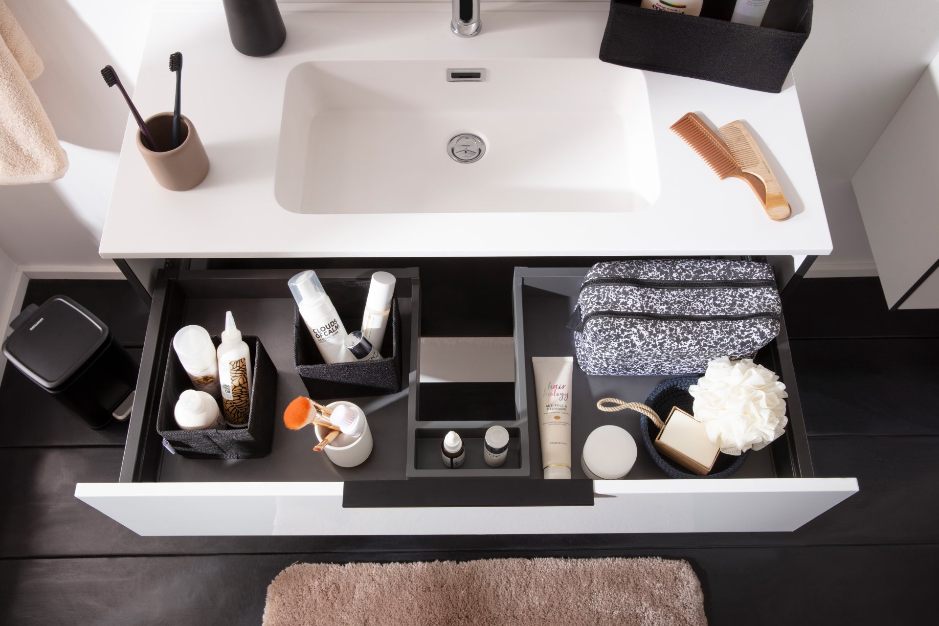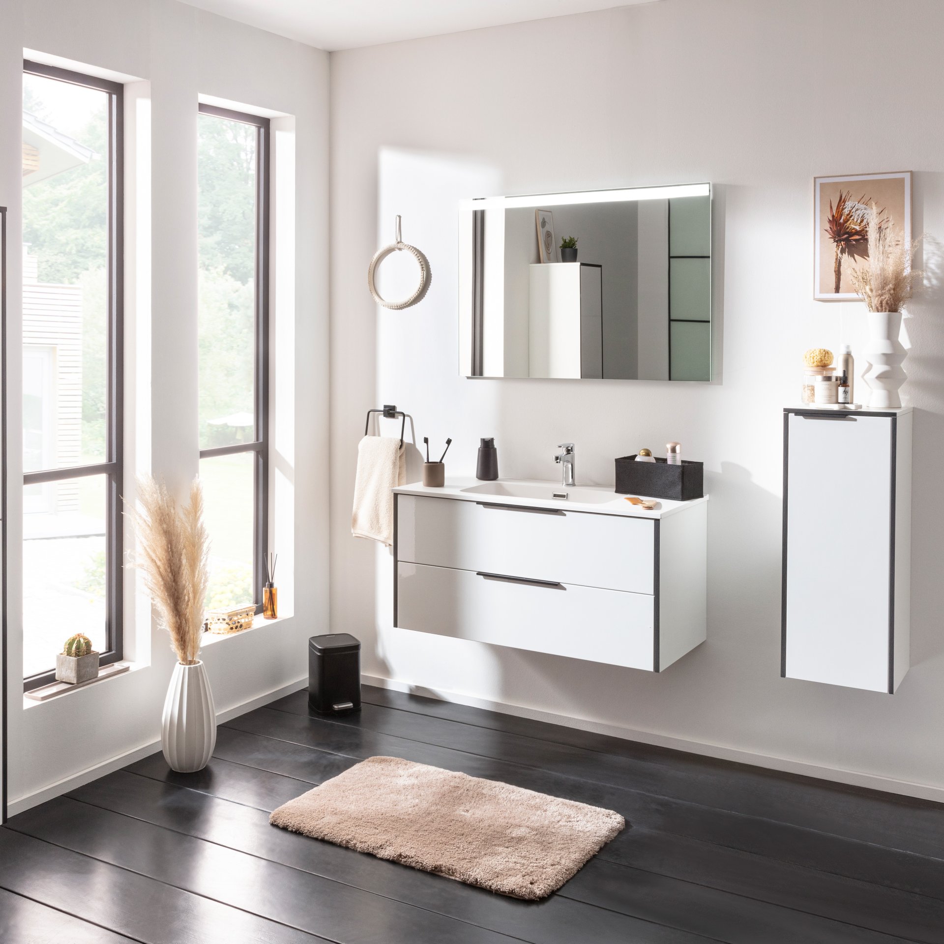 Mit dem 2-teiligen Badezimmermöbel Set aus der Serie FLAIR von Fackelmann holst Du Dir Eleganz in Dein Bad. Klares Weiß wird mit einer Dekorkante in trendigem Anthrazit eindrucksvoll in Szene gesetzt. So entsteht ein Ensemble in einem zeitlosen, leicht urbanen Stil, das sich spielerisch in verschiedene Badkonzepte einfügt. Der Waschtischunterschrank ist mit zwei geräumigen Schubladen ausgestattet, die mit dem modernen Soft-Close-System sanft schließen. Sie bieten überragenden Stauraum für verschiedene Badaccessoires, Kosmetikartikel oder Handtücher. Formvollendet sitzt das Gussmarmor Waschbecken in Weiß auf dem Unterschrank. Mit der tiefen Waschmulde bleiben Wasserspritzer da, wo sie hingehören. Zwei schwarze Griffleisten aus Metall harmonieren perfekt mit der Dekorkante und unterstützen die edle Optik. Das FACKELMANN FLAIR Waschbecken mit Unterschrank 101 cm breit, Weiß/Anthrazit, Waschbecken Gussmarmor Weiß matt wird vormontiert geliefert und ist damit schnell in Deinem Badezimmer integriert. Badmöbel von Fackelmann werden mit viel Liebe zum Detail in Deutschland hergestellt und zeichnen sich durch ihre bewährte Qualität aus.