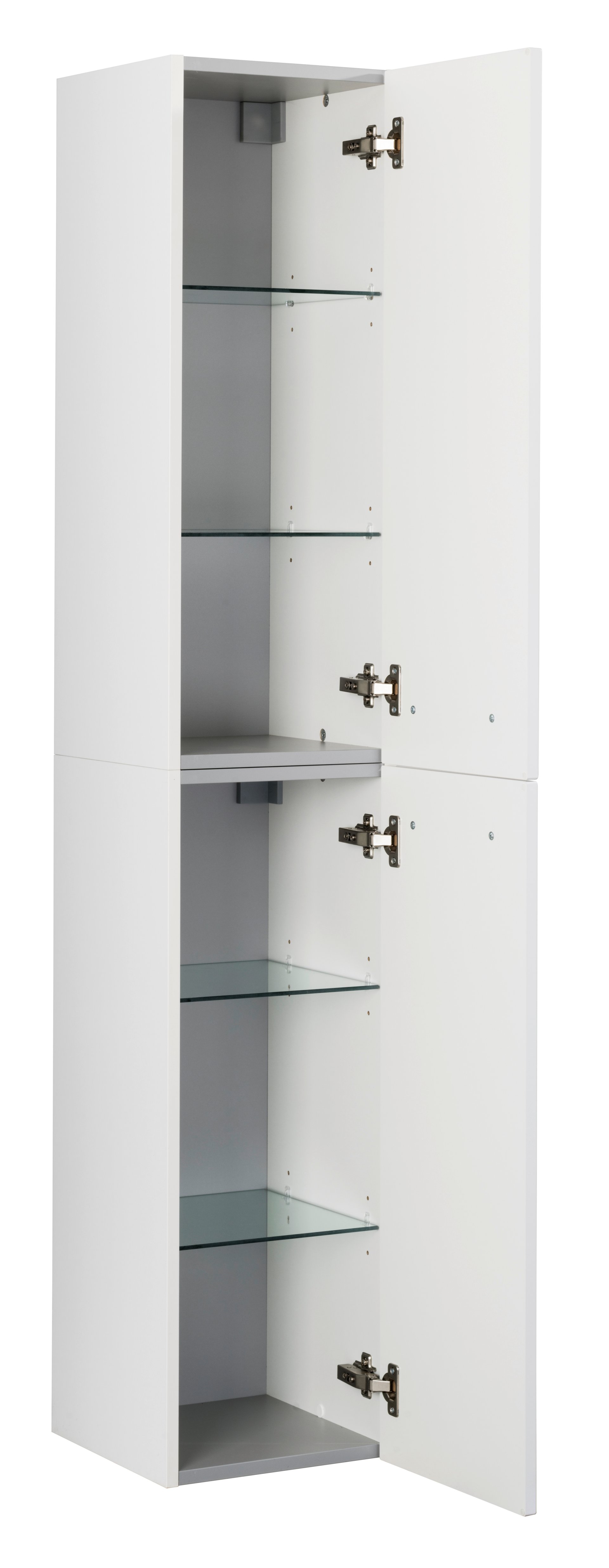 - Ausstattung: 2 Türen, 4 Glaseinlegeböden, gedämpfte Scharniere, Rückwand und Querteile silbergrau