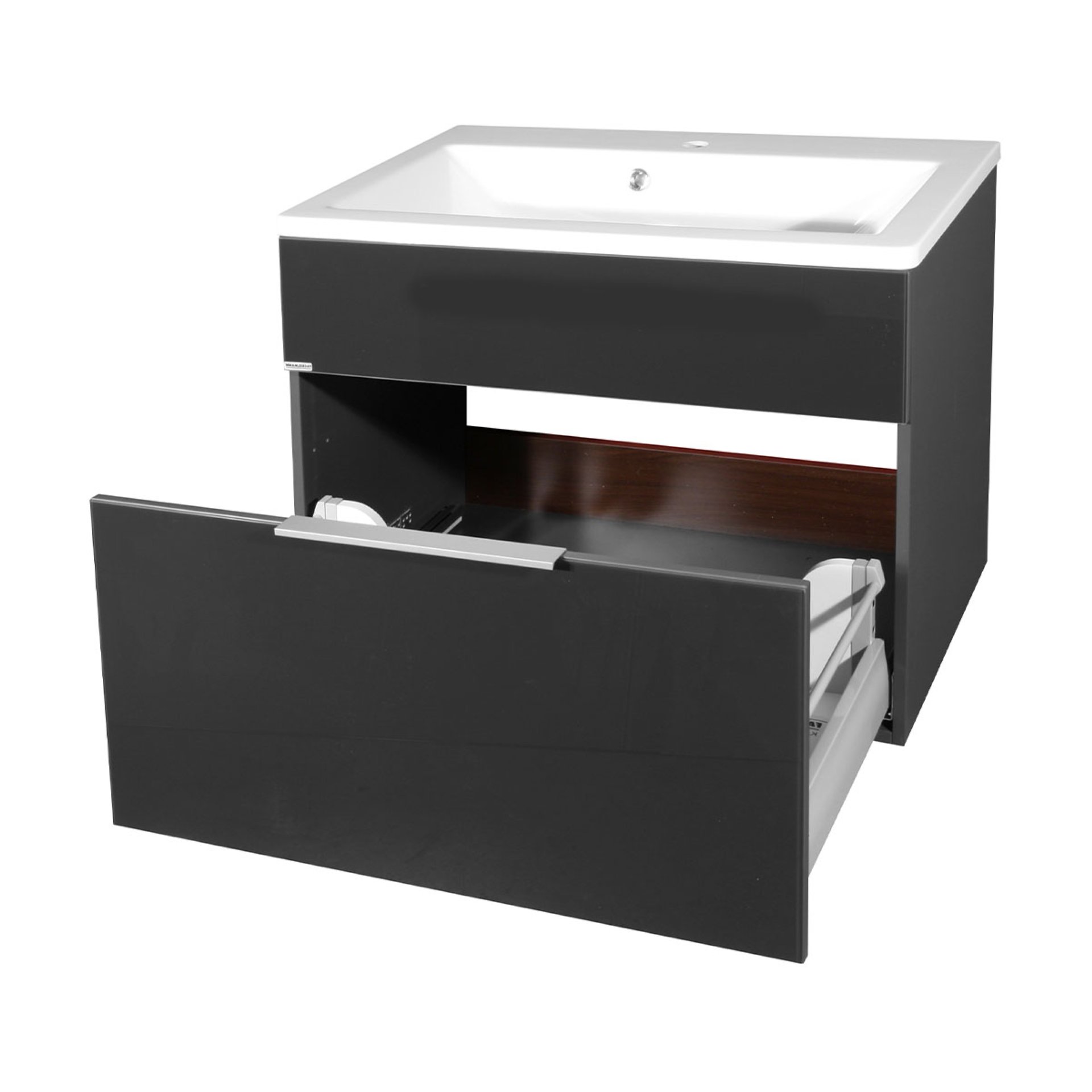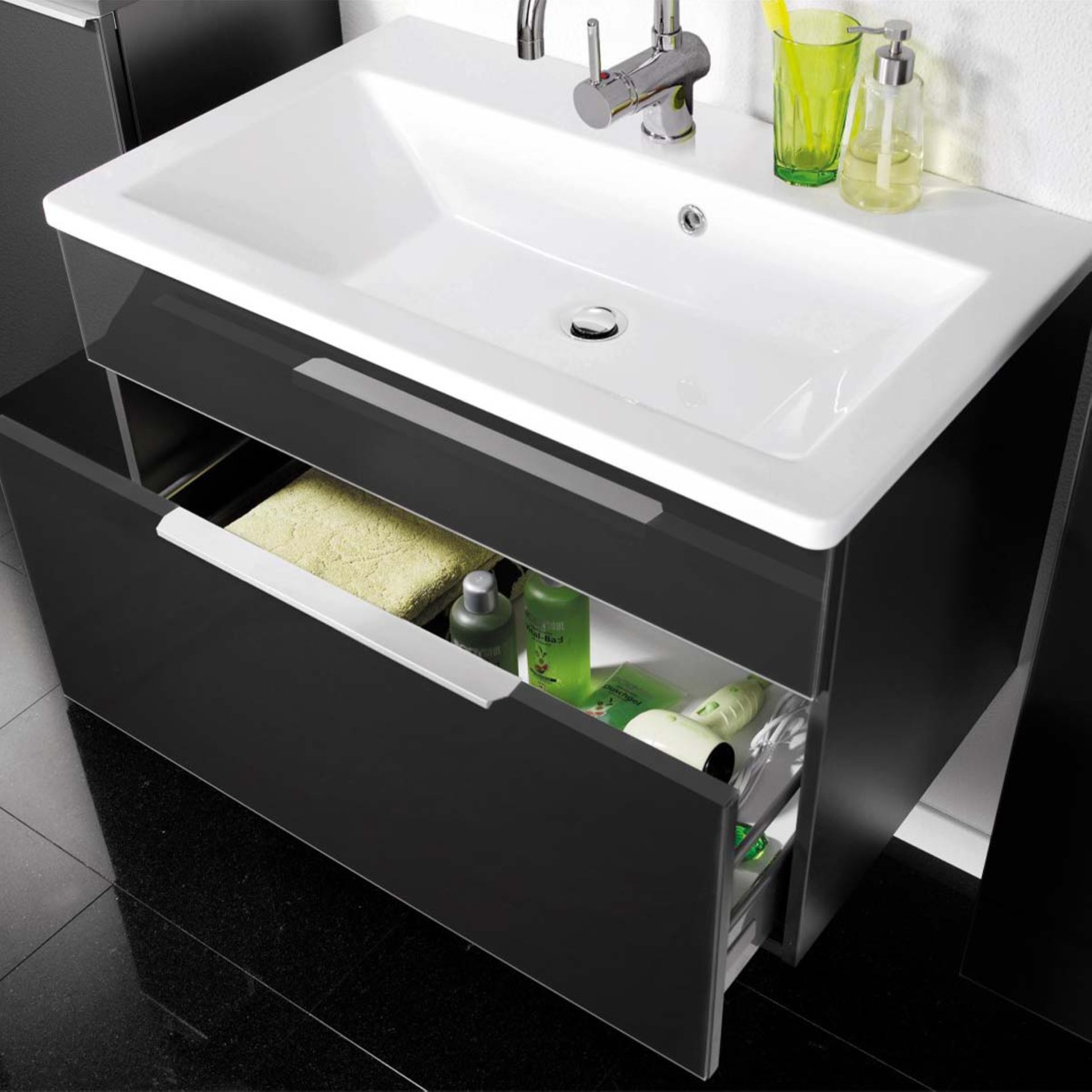 Unvergleichlich elegant. Jeden Morgen! Mit dem zweiteiligen Badmöbel Set aus der Serie KARA von Fackelmann erfreust Du Dich jeden Tag aufs Neue. Eine exklusive Front aus schwarzem Glas beeindruckt Dich bei jedem Gang ins Badezimmer. Gebürstete Aluminiumgriffe unterstreichen die Hochwertigkeit des Waschtischunterschranks mit einer Großraumschublade. Sie lässt sich mit dem Soft-Close System sanft schließen. Das moderne Badmöbel bietet ausreichend Stauraum für Deine Badaccessoires und sorgt mit dem Schubkasteneinsatz (Art.Nr. 90290) für eine aufgeräumte Schublade. Das weiße Waschbecken aus Gussmarmor überzeugt durch eine tiefe Waschmulde. Wasserspritzer bleiben da, wo sie hingehören. Mit viel Liebe zum Detail werden die Möbel in Deutschland herstellt. Das Fackelmann KARA Badmöbel Set 2-teilig 80cm, Anthrazit, Gussmarmor, 1 Schublade ist vormontiert und damit kannst Du es schnell und einfach in Deinem Badezimmer aufstellen.
