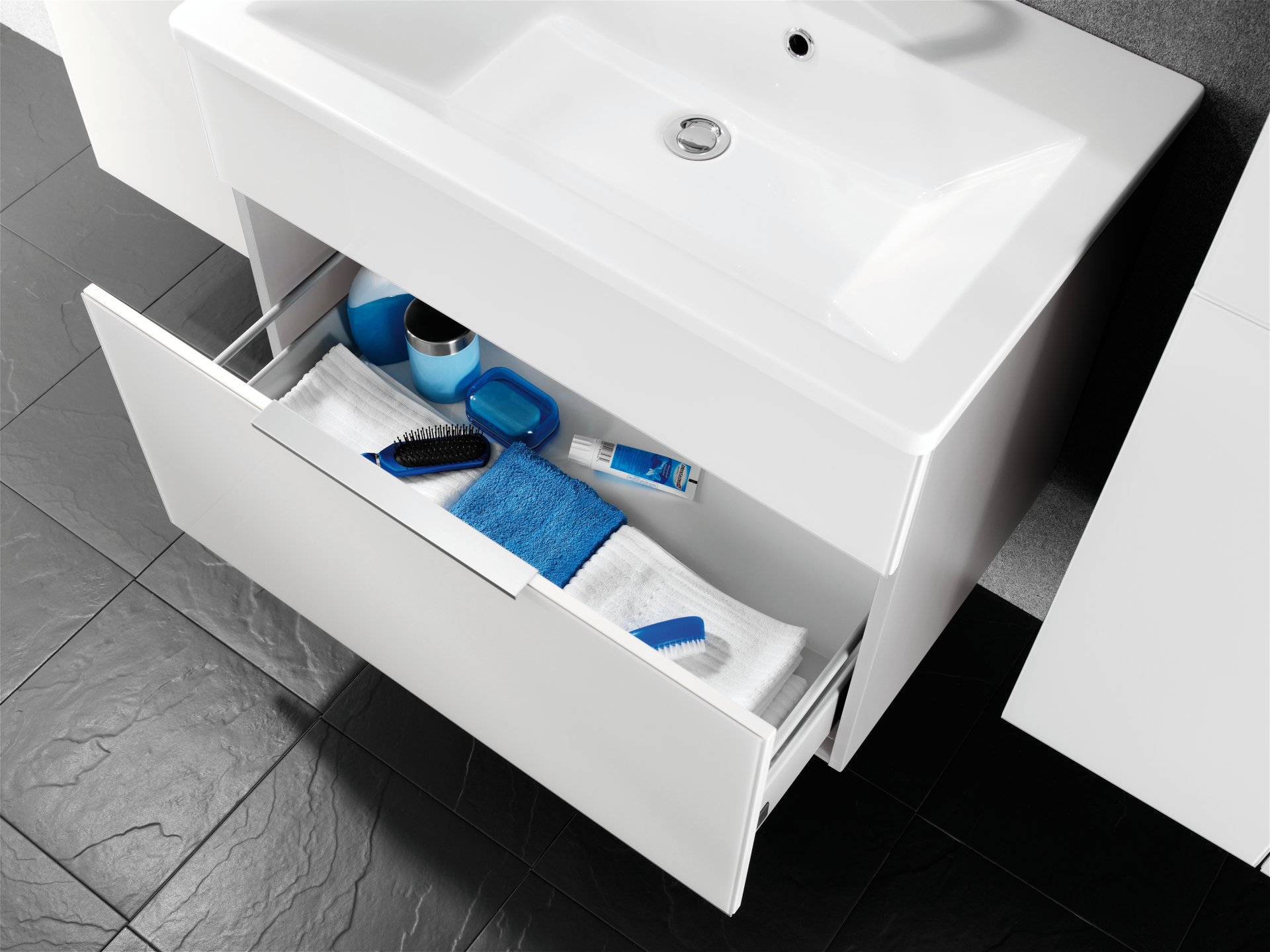 Ein Traum in Weiß! Mit dem strahlend weißen, zweiteiligen Badmöbel Set aus der Serie KARA von Fackelmann erfreust Du Dich jeden Tag aufs Neue. Eine exklusive Front aus weißem Glas beeindruckt Dich bei jedem Gang ins Badezimmer. Gebürstete Aluminiumgriffe unterstreichen die Hochwertigkeit des Waschtischunterschranks mit einer Großraumschublade. Sie lässt sich mit dem Soft-Close System sanft schließen. Das moderne Badmöbel bietet ausreichend Stauraum für Deine Badaccessoires und sorgt mit dem Schubkasteneinsatz (Art.Nr. 90290) für eine aufgeräumte Schublade. Durch seine tiefe Waschmulde überzeugt das weiße Waschbecken aus Gussmarmor von Fackelmann. Wasserspritzer bleiben da, wo sie hingehören. Mit viel Liebe zum Detail werden die Möbel in Deutschland herstellt. Das Fackelmann KARA Badmöbel Set 2-teilig 80cm, Weiß, Gussmarmor, 1 Schublade ist vormontiert und damit kannst Du es schnell und einfach in Deinem Badezimmer aufstellen.