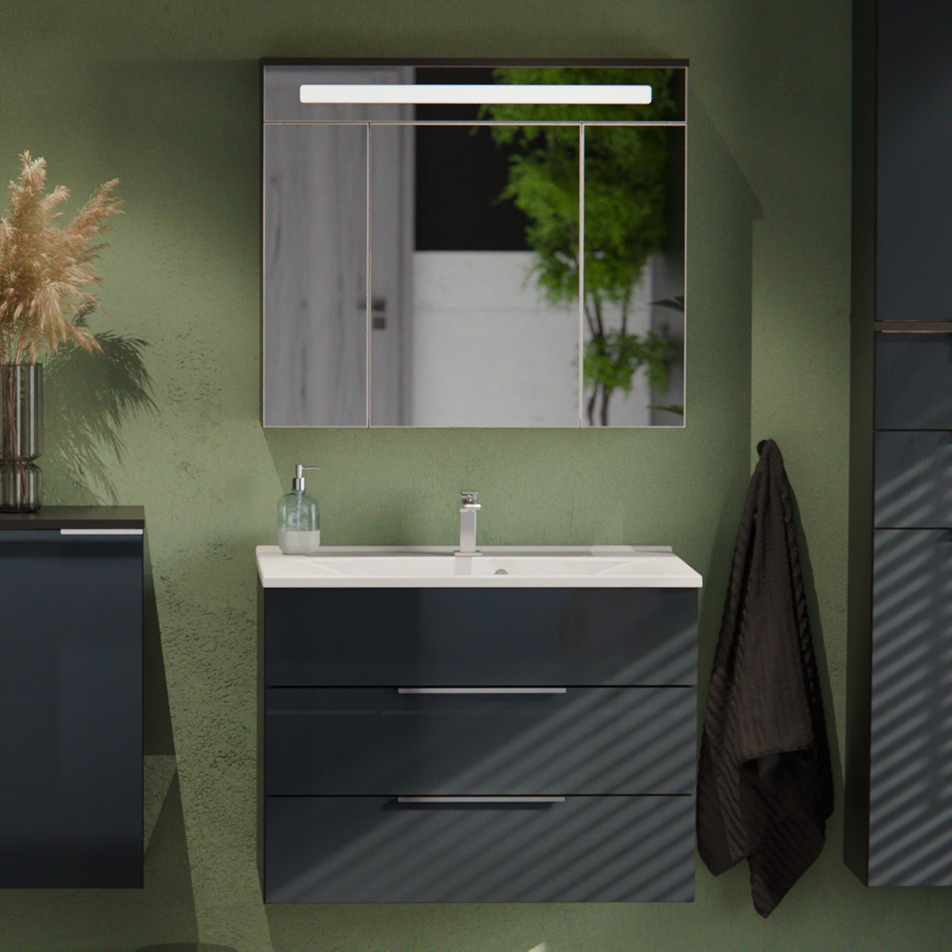 Unvergleichlich elegant! Das 2-teilige Badmöbel-Set aus der Serie KARA von Fackelmann bringt Stil und Eleganz ins Badezimmer. Die exklusive Front aus schwarzem Glas beeindruckt Dich bei jedem Gang ins Badezimmer. Ein 80 cm breiter Waschtischunterschrank sorgt mit zwei Schubladen für jede Menge Stauraum. Für zusätzliche Ordnung sorgt der Schubkasteneinsatz (Art.Nr. 90290). Gebürstete Aluminiumgriffe unterstreichen die Hochwertigkeit des Waschtischunterschranks. Beide Schubladen lassen sich dank des Soft-Close Systems sanft schließen. Das weiße Waschbecken aus Gussmarmor überzeugt durch eine tiefe Waschmulde. Ein schwarzer LED-Spiegelschrank sorgt für Beleuchtung und Stauraum über dem Waschbecken. Hinter drei Türen befinden sich sechs Glaseinlegeböden, die für Ordnung sorgen. Die LED-Beleuchtung illuminiert Dein Badezimmer. Die Möbel von Fackelmann werden mit viel Liebe zum Detail in Deutschland hergestellt. Das Fackelmann KARA Badmöbel Set 3-teilig, 80 cm, Anthrazit, Gussmarmor, 2 Schubladen ist vormontiert und kann so schnell und einfach in Deinem Badezimmer einziehen.