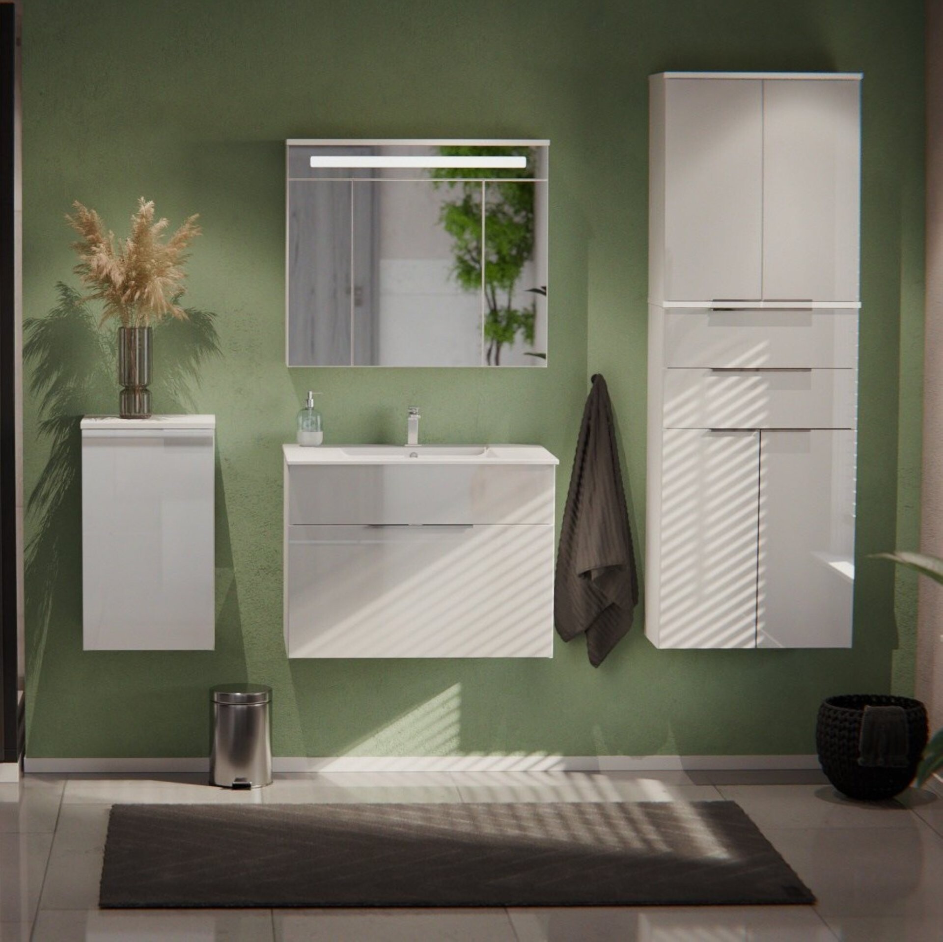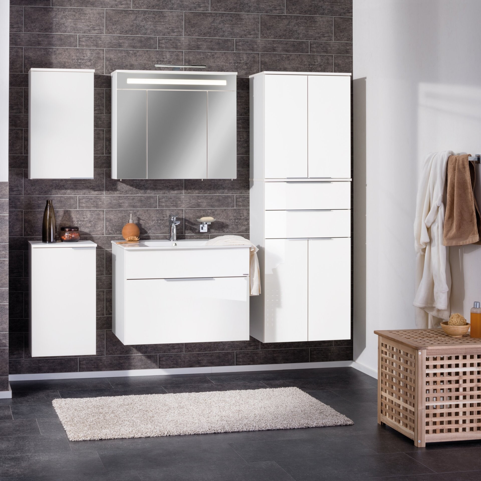 Zeitloses Weiß! Korpus in mattem Weiß. Front in lackiertem weißen Glas. Strahlend! Frisch! Elegant! So präsentiert sich das 3-teilige Badmöbelset aus der Serie KARA von Fackelmann. Ein Blickfang der Extraklasse. Der Waschbeckenunterschrank mit dezent gehaltenen aluminiumfarbigem Griff verfügt über eine Großraumschublade mit weißer Front. Ausreichend Stauraum für viele Badaccessoires. Passgenau auf den Unterschrank sitzt das weiße Waschbecken aus hochwertiger Keramik. Kleine Ablageflächen rechts und links vom Waschbecken bieten Platz für die Dinge des täglichen Pflegerituals. Komplett wird das Badmöbel Set mit dem 80 cm breiten LED Spiegelschrank. Die waagerechte LED Beleuchtung über den Spiegeltüren sorgt für ausreichend Licht beim täglichen Pflegeritual. Durchdacht auch die Unterteilung im Inneren. Sechs Glaseinlegeböden sorgen für Ordnung und halten Deine Badeaccessoires immer griffbereit. Badmöbel von Fackelmann werden mit viel Liebe zum Detail in Deutschland hergestellt. Das Fackelmann KARA Badmöbel Set 3-teilig, 80 cm, Weiß, Keramik, 1 Schublade ist vormontiert und kann so schnell und einfach in Deinem Badezimmer einziehen.