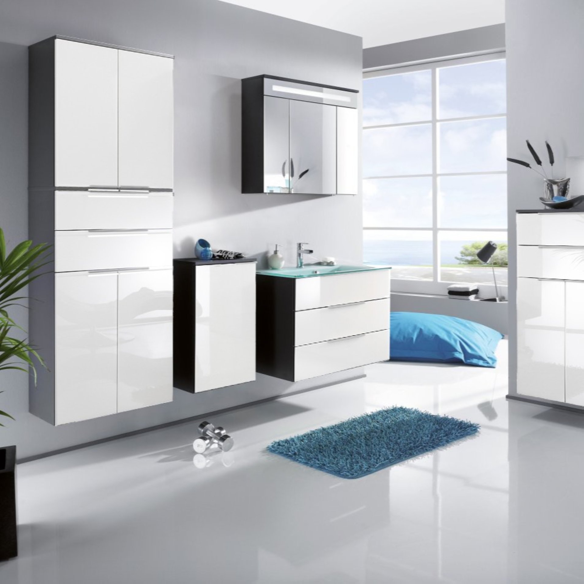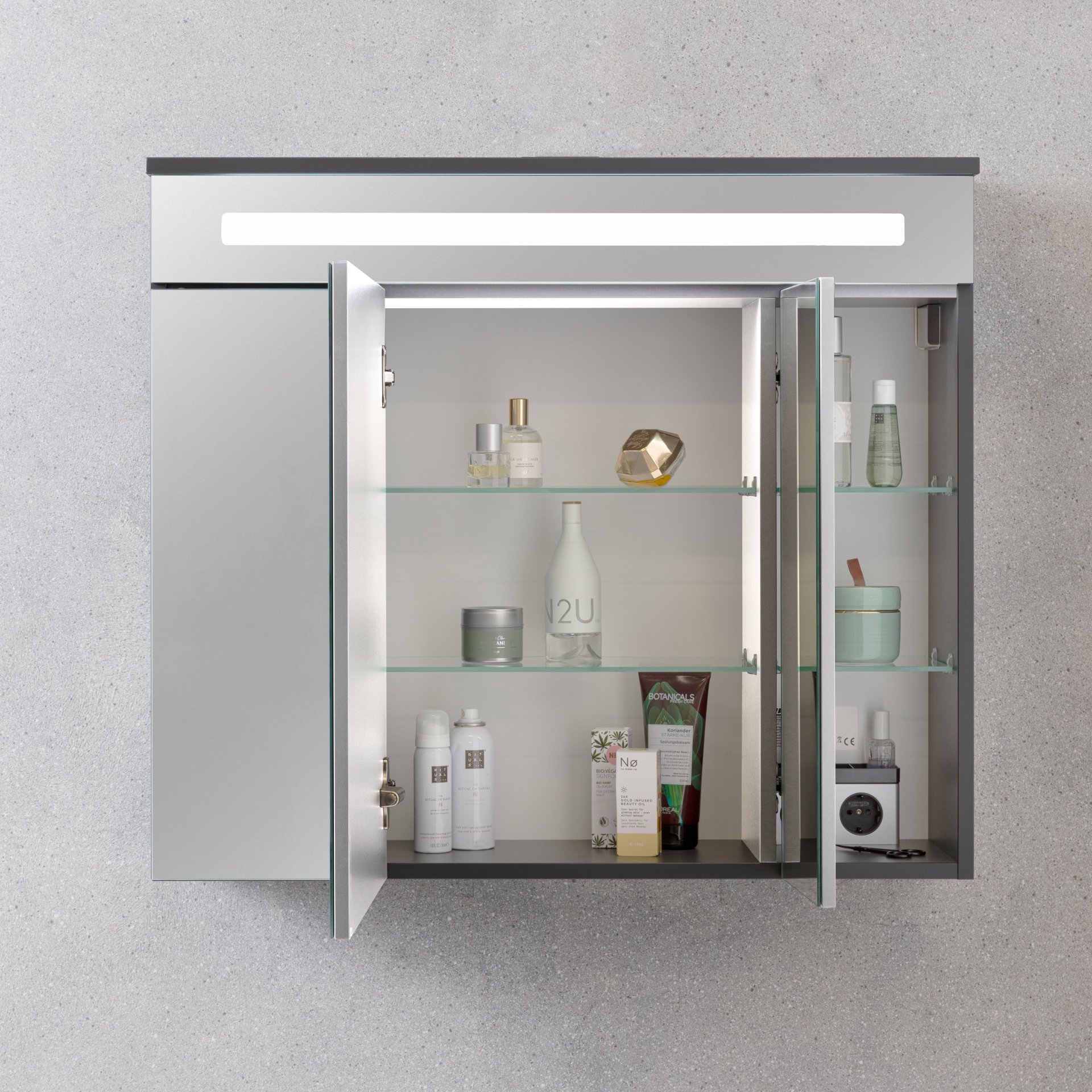 Der moderne Fackelmann LED Spiegelschrank mit anthrazit farbigem Korpus und weißen Türkanten hält viele Überraschungen bereit. Im Inneren des Schrank befinden sich sechs Glaseinlegeböden. So sind alle Deine Kosmetikartikel immer ordentlich aufgeräumt und immer griffbereit.Die energiesparende LED Beleuchtung punktet mit 7,35 Watt, die von 84 Hochleistungs-LED's zur Verfügung gestellt werden und sie ist austauschbar. Sollte das Licht nicht ausreichen ist optional eine passende LED Aufsatzleuchte verfügbar (Art.Nr. 82960 nicht im Lieferumfang enthalten.) Drei Spiegeltüren lassen sich durch die kleinen Spiegelschrankgriffe leicht öffnen. Bei geöffneten Zustand und entsprechendem Winkel entsteht ein 3D-Effekt. So wird das Schminken oder Rasieren zu einem ganz neuen Erlebnis. Gedämpfte Scharniere gewährleisten ein sanftes Schließen der Türen. Im Fackelmann KARA LED Spiegelschrank mit einer Breite von 80 cm findest Du einen Schalter und eine Steckdose für die Elektrogeräte, wie Zahnbürste oder Rasierer, die Du in Deinem Bad benötigst. Badmöbel von Fackelmann werden mit viel Liebe zum Detail in Deutschland hergestellt. Der Fackelmann KARA Spiegelschrank 80 cm, Anthrazit/Weiß, ist vormontiert und kann so schnell und einfach in Dein Badezimmer einziehen.