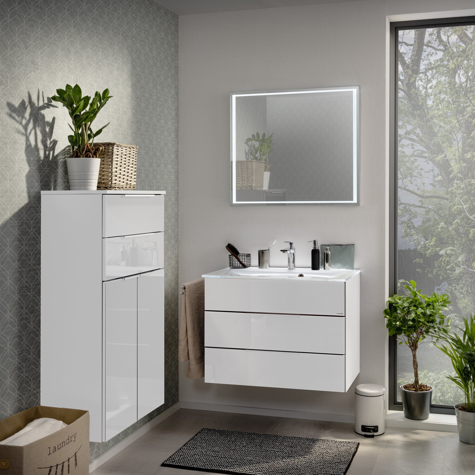 Badmöbel in Weiß gehören zu den unangefochtenen Klassikern in deutschen Badezimmern. Es soll ein extravaganter, zeitloser Badschrank mit viel Stauraum für Dein Badezimmer sein? Dann ist der moderne Fackelmann Midischrank mit lackierter Glasfront in strahlenden Weiß aus der Serie KARA genau der Richtige. Der Einlegeboden sorgt für eine sehr gelungene Unterteilung im Schrank. Hier finden Reinigungsmittel oder Handtücher einen sicheren und immer griffbereiten Platz. Die beiden geräumigen Schubladen bieten Kosmetikartikeln, Haarbürsten oder dem Fön einen gelungenen Raum. Damit ist Dein Badezimmer immer ordentlich aufgeräumt. Beide Schubladen lassen sich mit dem modernen Soft-Close-System sanft schließen. Mit den unauffälligen, aber den Schrank prägenden Griffleisten in Aluminiumoptik kannst Du die zwei Türen und zwei Schubladen des Midischranks leicht und sicher öffnen. Der Badezimmerschrank hat eine Höhe von 106 cm und ist ein exklusives Stilelement in Deinem neuen Bad. Bei den Midischränken aus der Serie KARA bietet der Hersteller Fackelmann weitere Kombinationen in Weiß und Anthrazit bei Korpus und Front an. Badmöbel von Fackelmann werden mit viel Liebe zum Detail in Deutschland hergestellt. Der Fackelmann KARA Midischrank 61 cm, Weiß ist vormontiert und kann so schnell und einfach in Dein Badezimmer einziehen.