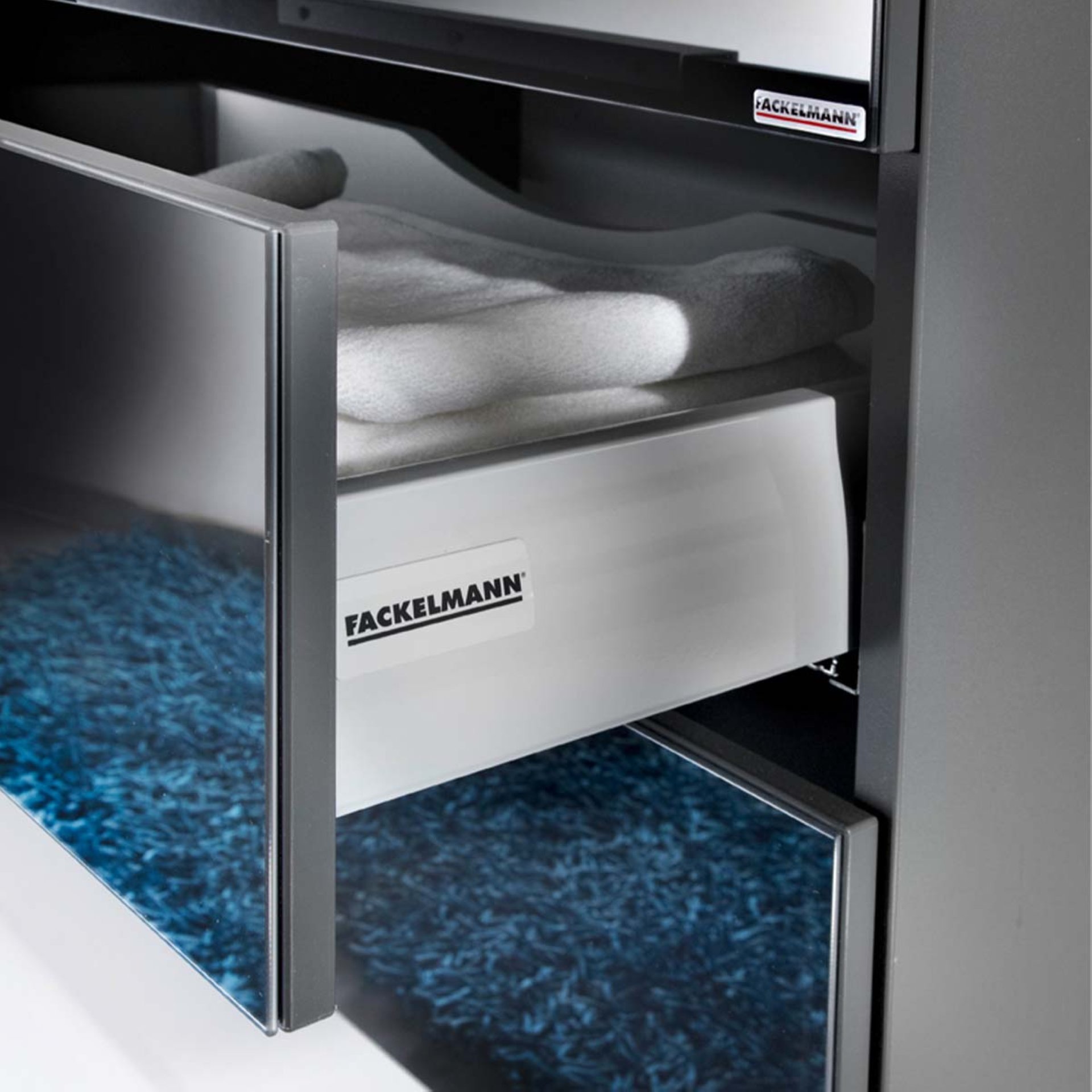 Unvergleichlich elegant. Jeden Morgen! Mit dem zweiteiligen Badmöbel Set aus der Serie KARA von Fackelmann erfreust Du Dich jeden Tag aufs Neue. Eine exklusive Front aus schwarzem Glas beeindruckt Dich bei jedem Gang ins Badezimmer. Gebürstete Aluminiumgriffe unterstreichen die Hochwertigkeit des Waschtischunterschranks. Beide Schubladen lassen sich mit dem Soft-Close System sanft schließen. Das mintfarbene Waschbecken aus Glas überzeugt durch eine tiefe Waschmulde. Ein zusätzliches Highlight bei Waschbecken aus Glas ist, das man sie mit einer Waschbeckenbeleuchtung (Art.Nr. 86300) einzigartig illuminieren kann. Mit viel Liebe zum Detail werden die Möbel in Deutschland herstellt. Das Fackelmann KARA Badmöbel Set 2-teilig 80cm, Anthrazit, Glas Mint, 2 Schubladen ist vormontiert und damit kannst Du es schnell und einfach in Deinem Badezimmer aufstellen.