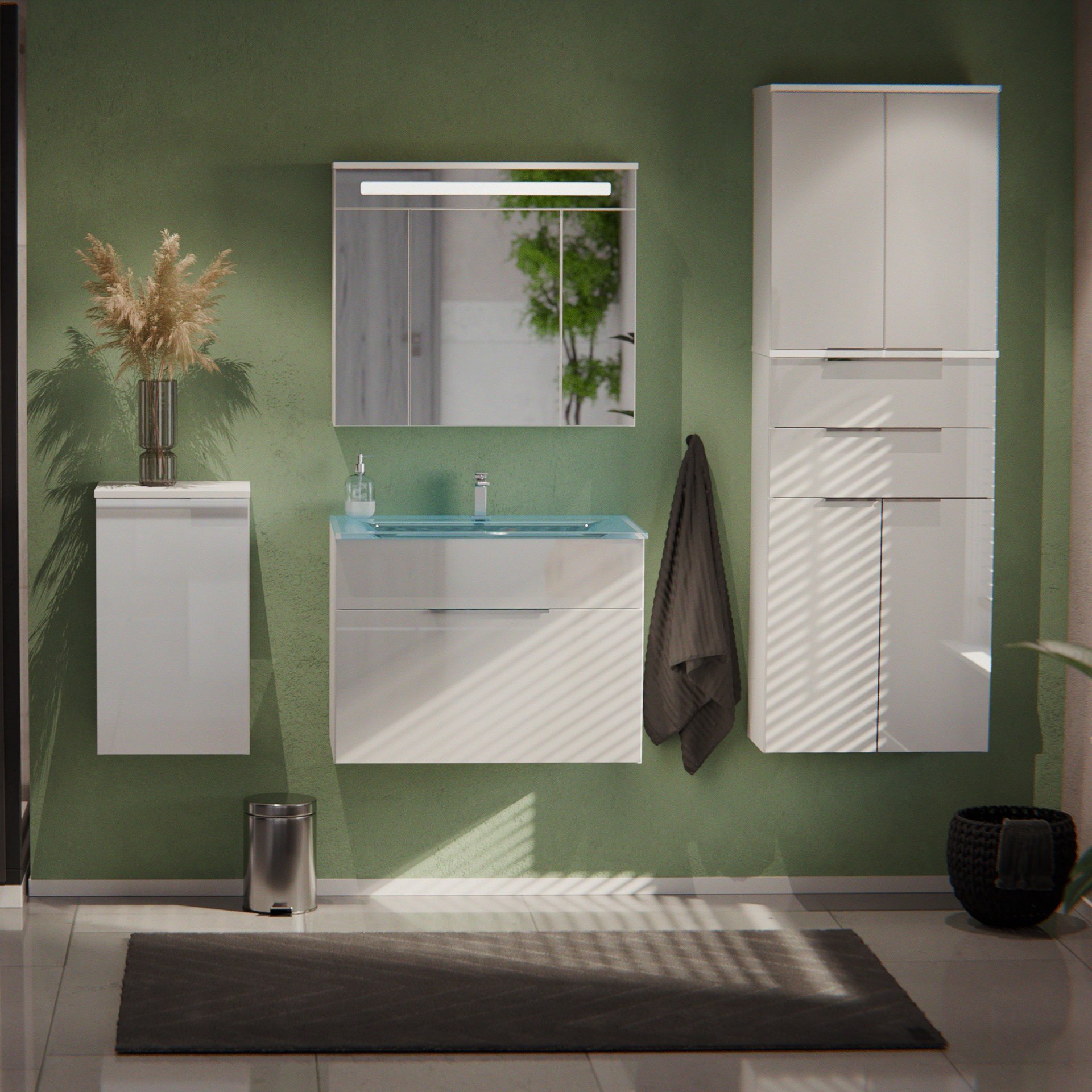 Fackelmann KARA Waschbecken mit Unterschrank 80 cm breit, Weiß, Waschbecken Glas Mint, 1 Schublade
