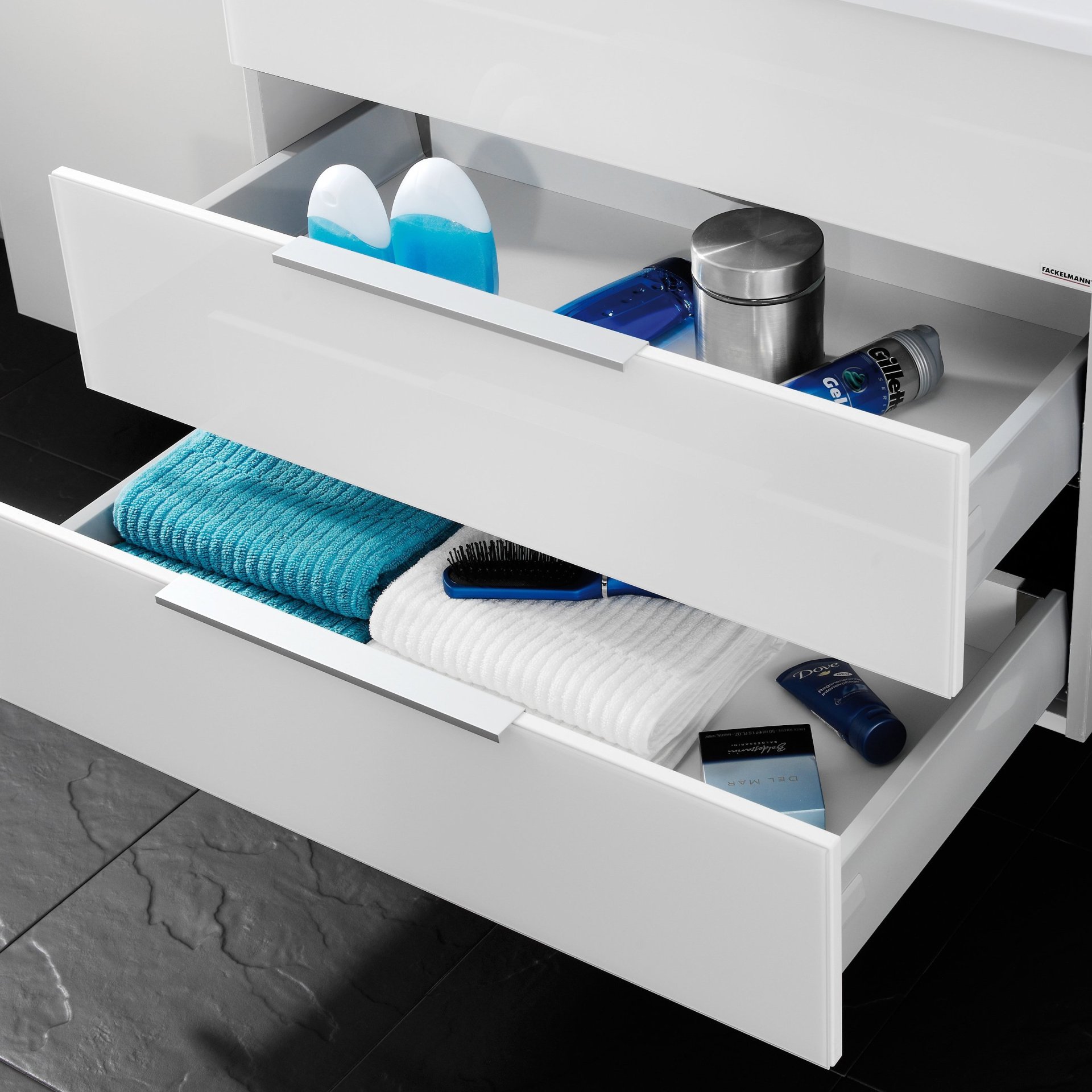 Zeitloses Weiß! Korpus in mattem Weiß. Front in lackiertem weißen Glas. Strahlend! Frisch! Elegant! So präsentiert sich das 2-teilige Badmöbelset aus der Serie KARA von Fackelmann mit mint farbigem Glasbecken. Ein Blickfang der Extraklasse. Der Waschbeckenunterschrank mit dezent gehaltenen aluminiumfarbigen Griffen verfügt über zwei Schubladen mit weißer Front. Ausreichend Stauraum für viele Badaccessoires. Ein cleverer Schubkasteneinsatz (Art.Nr. 80010) mit sechs Fächern, passend für die untere Schublade, sorgt für Ordnung (nicht im Lieferumfang enthalten). Komplett wird das Bild durch das hochwertige Glasbecken in Mint. Um Deinem Badmöbelset noch mehr Exklusivität zu verleihen, kannst Du das Glasbecken mit einer LED Waschbeckenbeleuchtung (Art.Nr. 86300) illuminieren (nicht im Lieferumfang enthalten). Sie ist einfach zu installieren und mit einem Bewegungsmelder ausgestattet. Badmöbel von Fackelmann werden mit viel Liebe zum Detail in Deutschland hergestellt. Das Fackelmann KARA Badmöbel Set 2-teilig, 80 cm, Weiß, Glas Mint, 2 Schubladen ist vormontiert und kann so schnell und einfach in Deinem Badezimmer einziehen.