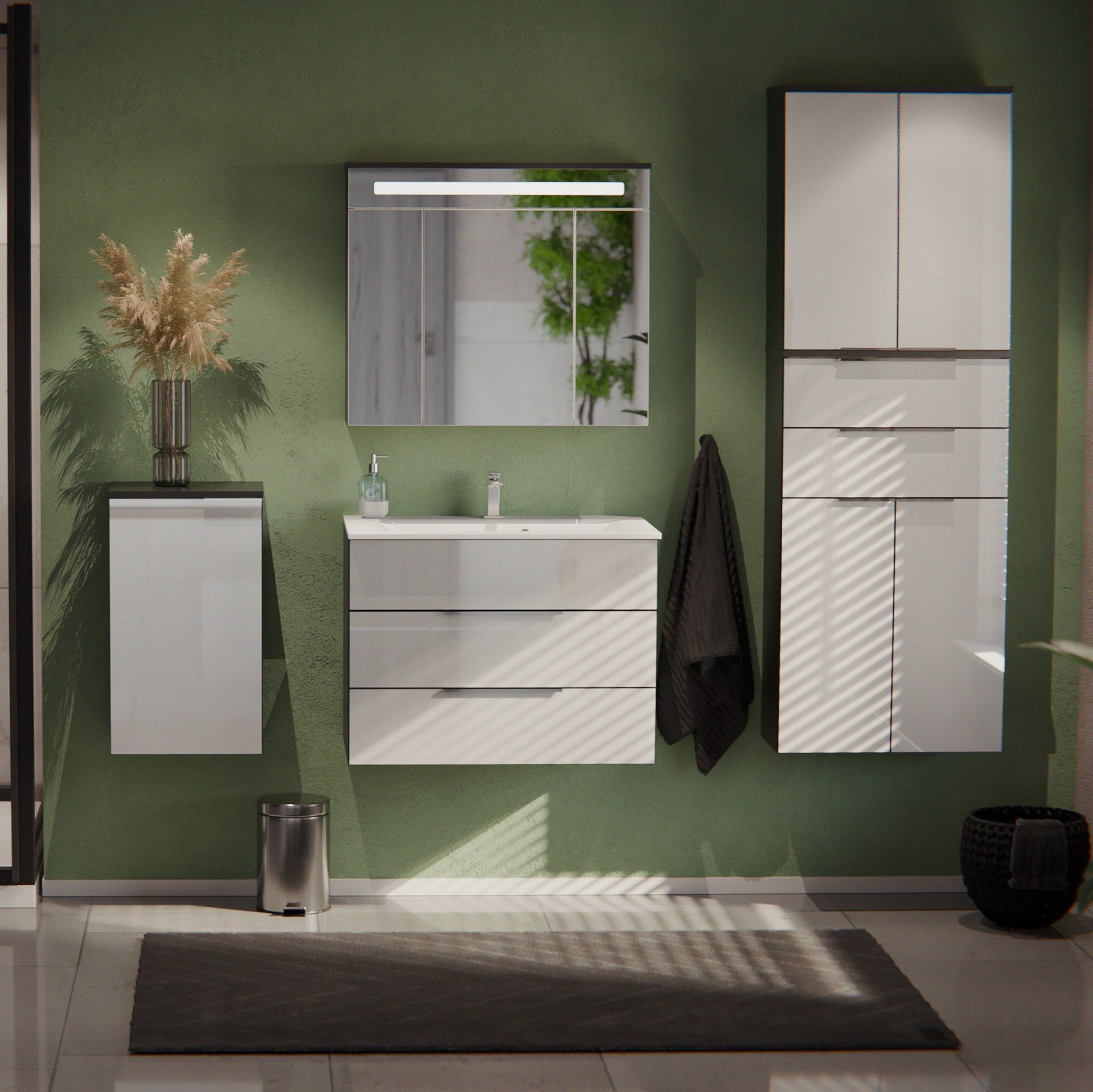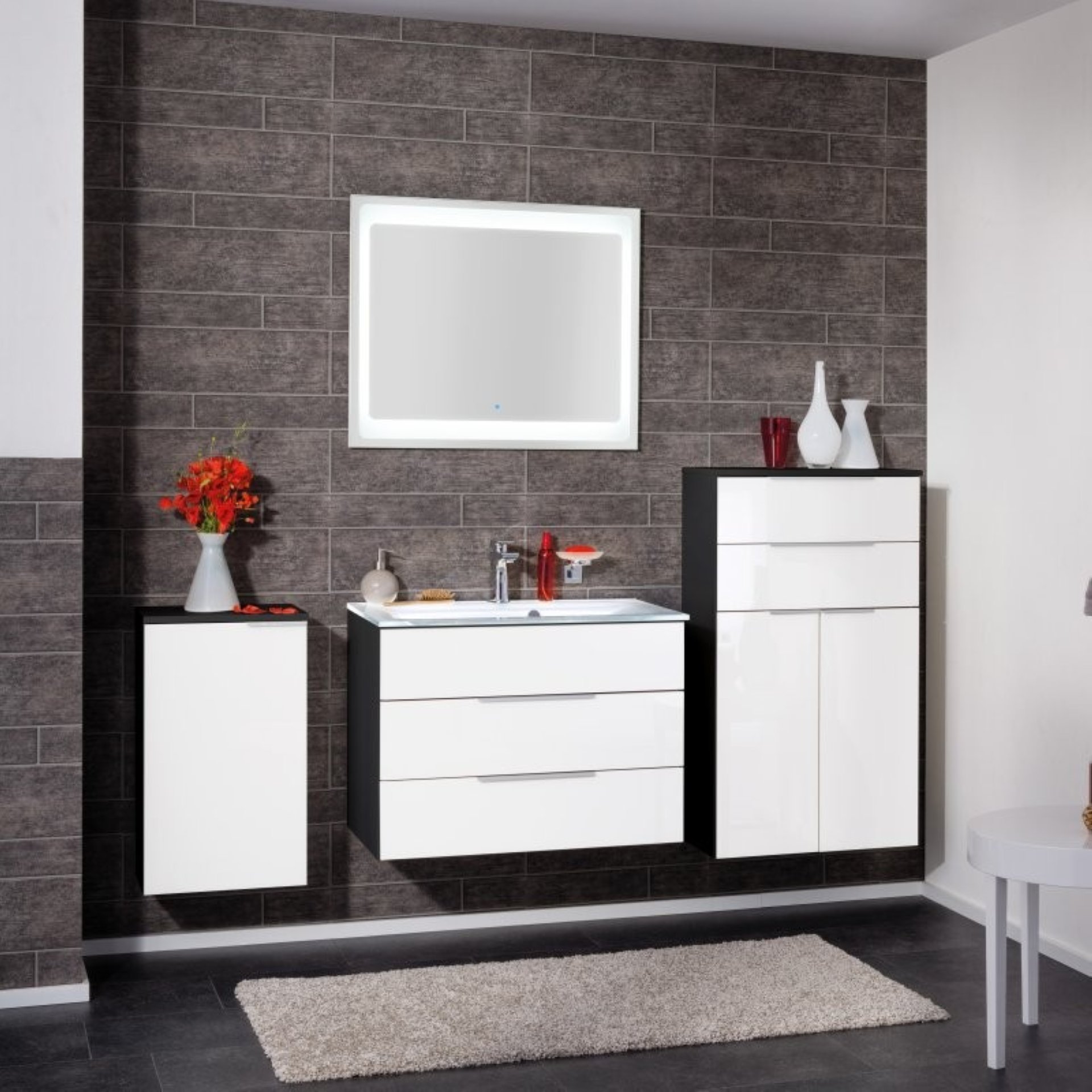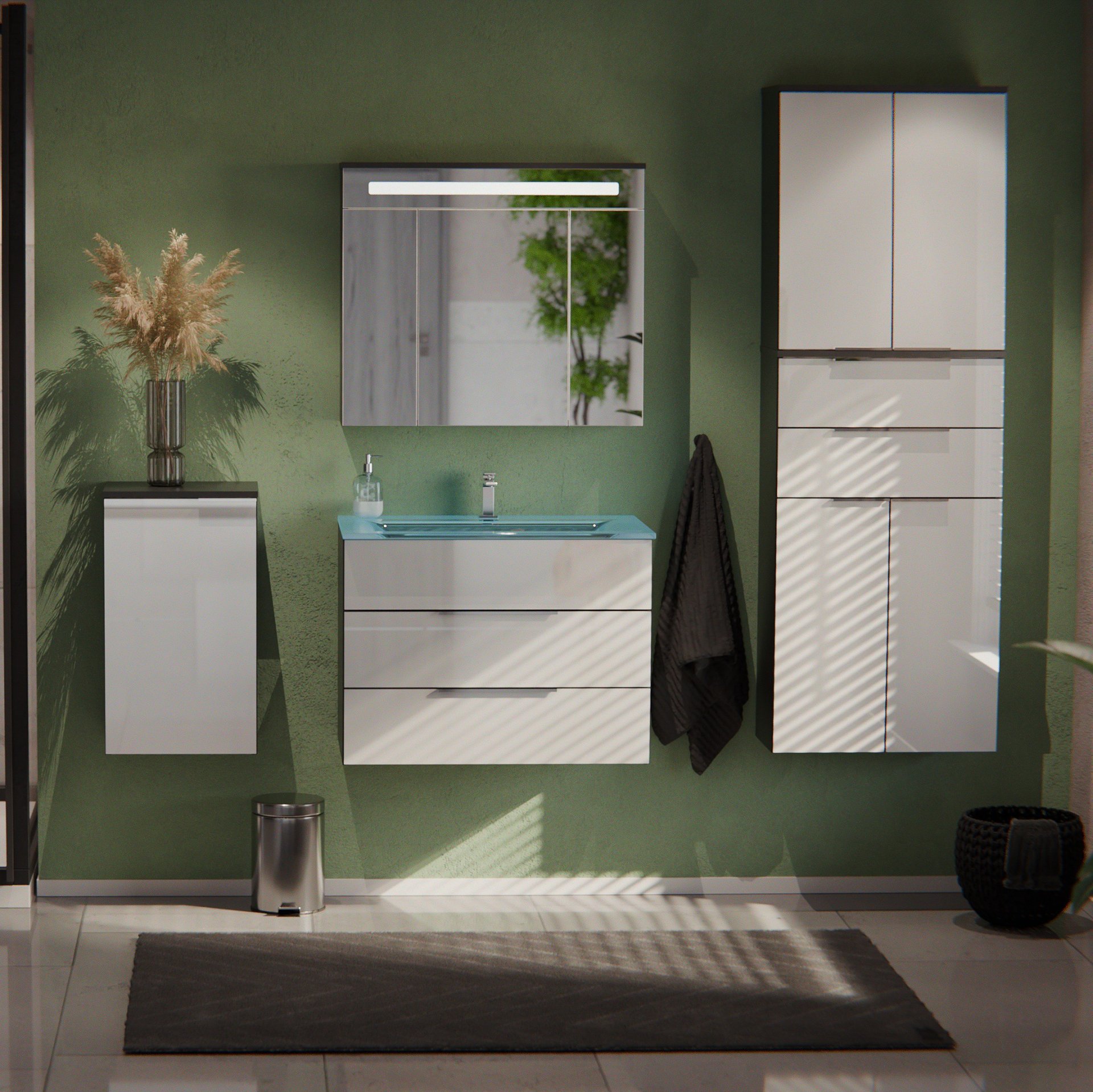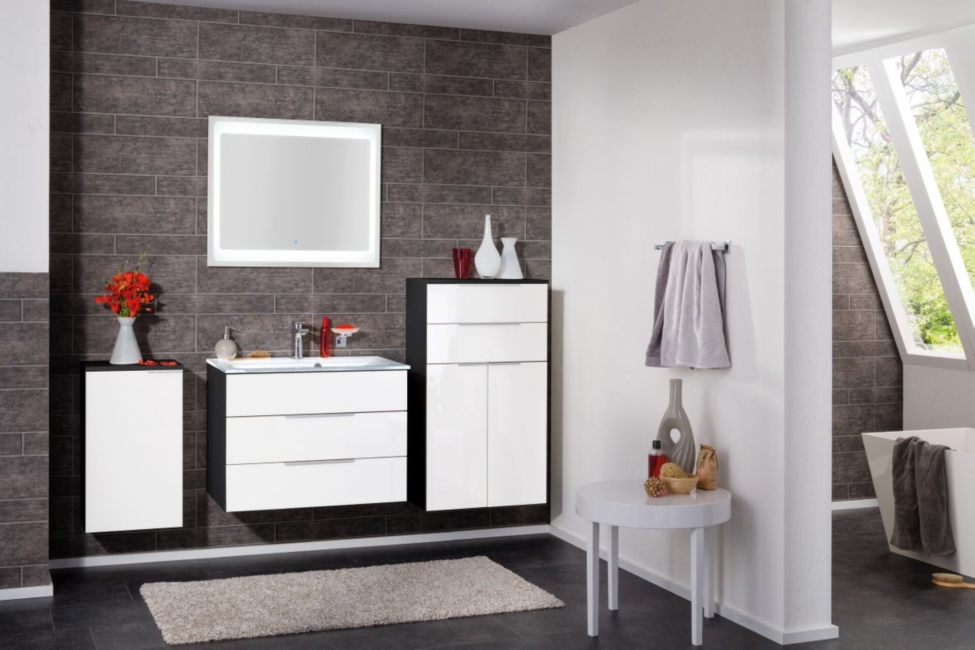 - Design: Korpus Schwarz/Anthrazit, Front Weiß mit lackiertem Glas