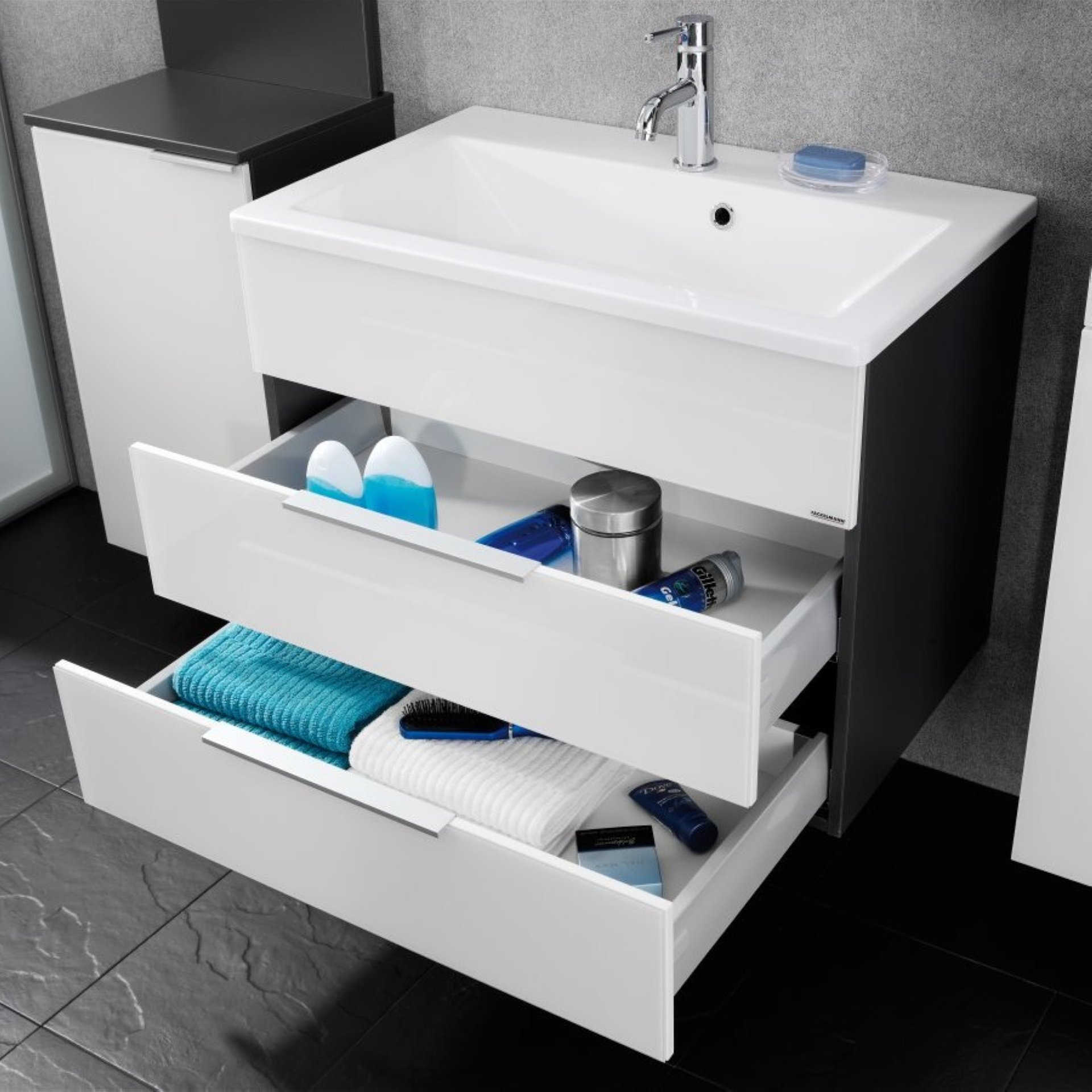 Kontrast pur! Schwarzer/Anthraziter Korpus trifft auf strahlende weiße Front. Der exklusive Fackelmann Waschtischunterschrank mit zwei Schubladen und einer Breite von 80 cm aus der Serie KARA hat eine lackierte Glasfront in Weiß. Der Korpus ist in edlem Schwarz/Anthrazit gehalten. Mit einem speziellen Raumsparsiphon (inklusive) gelingt eine weitgehend optimale Ausnutzung der oberen Schublade. So bietet das moderne Badmöbel ausreichend Stauraum für Deine Badaccessoires. Das Soft-Close-System garantiert ein sanftes Schließen. Der exklusive Waschtischunterschrank wird mit viel Liebe zum Detail in Deutschland vormontiert. Damit ist der Fackelmann KARA Waschbeckenunterschrank 80 cm, 2 Schubladen, Schwarz/Weiß ganz leicht in Deinem neuen Badezimmer integriert.