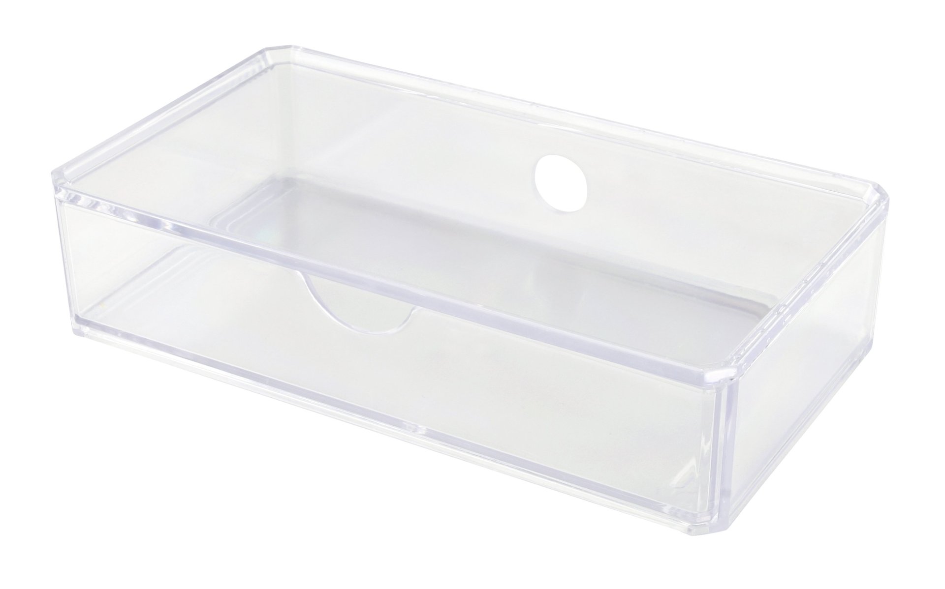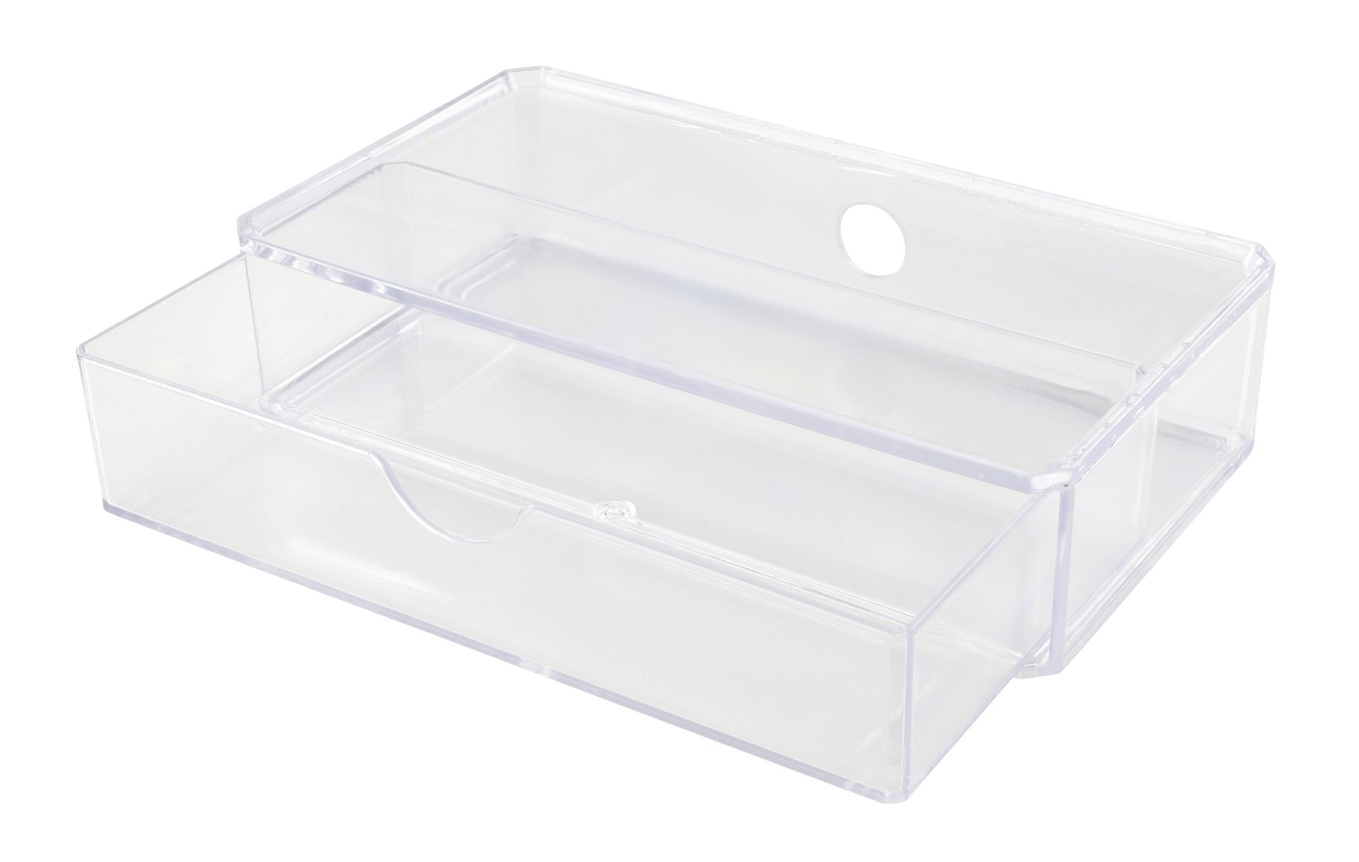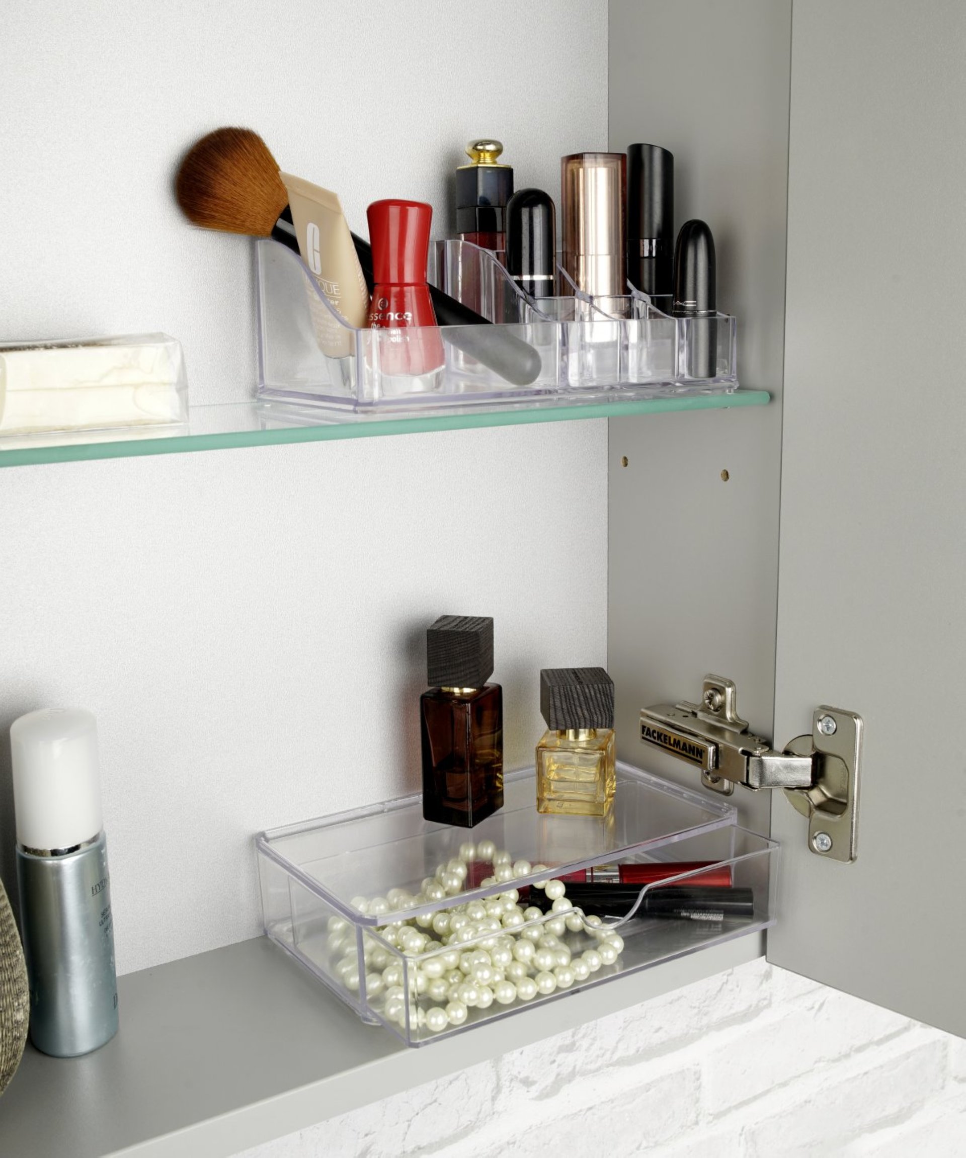 Mit dem Kosmetik Organizer mit Schublade von Fackelmann kannst Du Deine Kosmetikartikel im Spiegelschrank oder in der Schublade Deines Waschtischunterschranks ordentlich aufräumen. So sind alle Accessoires für das tägliche Pflegeritual immer griffbereit. Der Make-Up Organizer mit Schublade ist aus hochwertigem, transparenten Kunststoff. Sein aufschiebbares Fach bietet Platz für Schmuck, Lippenstift, Lidschatten, Pinsel, Schwämme, Wimperntuche und vielen anderen Dingen. Vier Anti-Rutschpuffer garantieren Standsicherheit und Rutschfestigkeit. Damit lässt sich der Organizer für Kosmetik auch auf einem Waschtisch optimal einsetzen. Solltest Du mehr Platz benötigen, dann kannst Du den Kosmetik Organizer (Art.Nr. 86894) einfach oben drauf stellen.