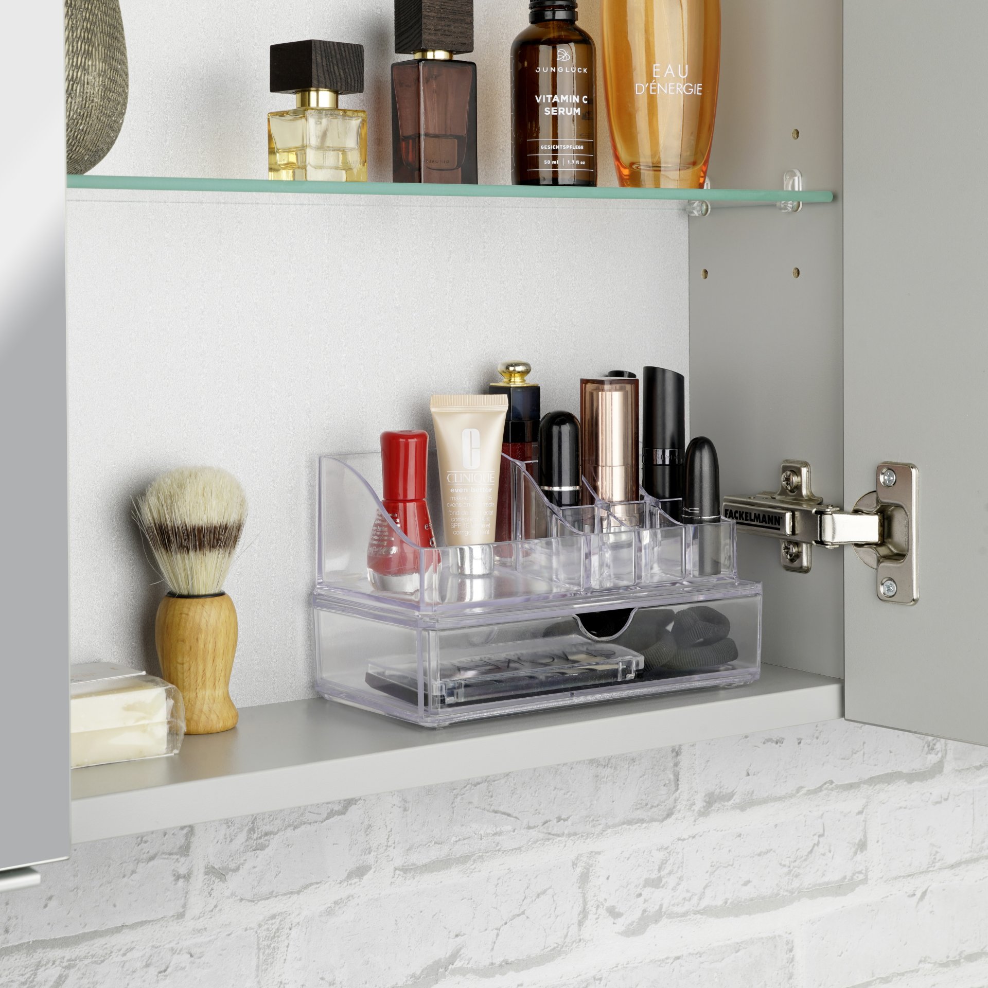 Jubel bei allen Ordnungsliebhabern. Zwei robuste Kosmetik Organizer in transparentem Kunststoff für Lippenstift, Eyeliner, Pinsel, Rasierklingen und all die anderen kleinen Kosmetikartikel. Endlich finden sie ihren perfekten Platz und sind immer griffbereit. So macht das tägliche Pflegeritual gleich noch mehr Spaß. Die Rutschpads verleihen den Kosmetik Organizern einen sicheren Stand. Sie passen in Spiegelschränke. Machen ein guten Eindruck auf Glasablagen und sind auf Schminktischen gern gesehen. Platziere den Kosmetik Organizer mit Schublade unten und stelle darauf den Organizer mit seinen 8 Fächern. Das FACKELMANN Kosmetik Organizer Set, Transparent, aus Kunststoff ist flexibel einsetzbar und überzeugt mit seinem cleveren Platzangebot.