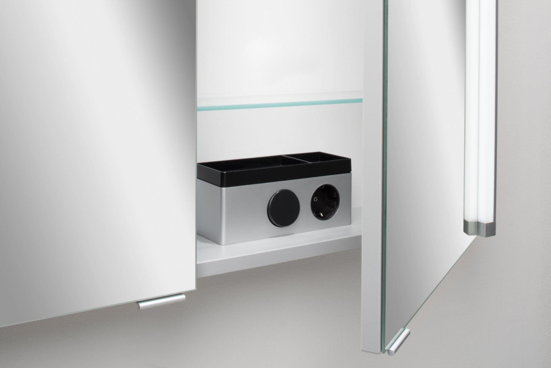 Der 81 cm breite Fackelmann LED-Spiegelschrank ist die perfekte Wahl für Dein modernes Badezimmer. Er verbindet stilvolles Design mit praktischer Funktionalität und schafft so nicht nur zusätzlichen Stauraum, sondern auch ein angenehmes Lichtambiente. Dank der zwei senkrechten LED-Reihen und dem DUO Leuchtprofil wird Dein Spiegelbereich immer gleichmäßig und hell beleuchtet. Das Besondere an dieser Beleuchtung ist, dass sie sowohl nach vorne als auch in die Spiegelfläche hineinstrahlt, was für eine klare und angenehme Lichtstimmung sorgt. Im Inneren des Schranks bieten zwei Glasböden genügend Platz für all Deine Badezimmerutensilien. Ein weiteres Highlight ist die integrierte Elektrobox, die sowohl einen Schalter für die LED-Beleuchtung als auch eine praktische Steckdose für Dich bereithält - ideal zum Anschließen von Rasierern oder anderen elektrischen Geräten. Das schlichte und zugleich zeitlose Design des Fackelmann LED-Spiegelschranks fügt sich nahtlos in Dein Badezimmer ein. Mit dem Fackelmann LED Spiegelschrank 81 cm triffst Du sicherlich die richtige Wahl für Dein Zuhause. Produkte von Fackelmann zeichnen durch ihre Qualität und Innovationen aus.