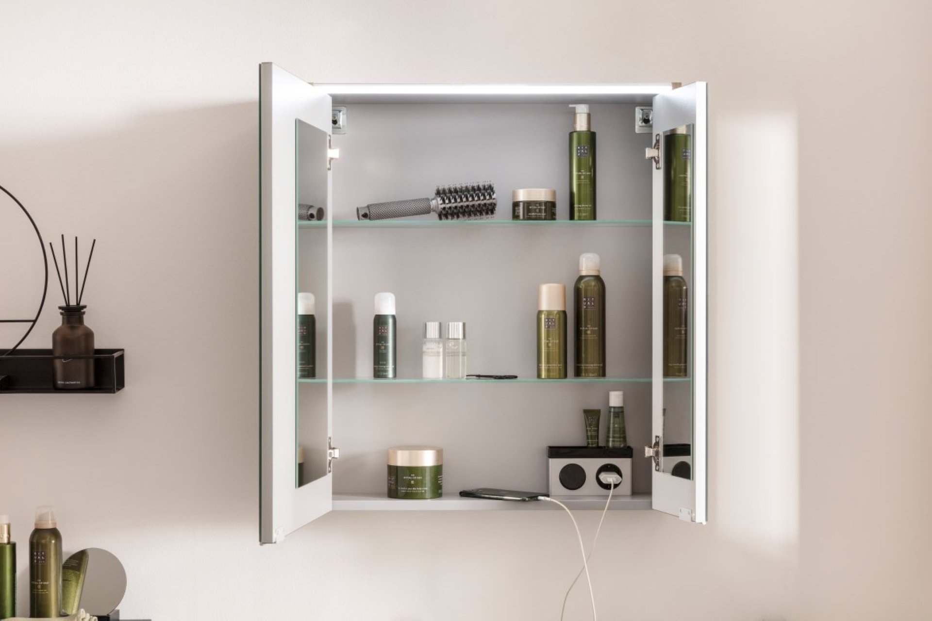 - Ausstattung: 2 Türen mit Innenspiegel, 2 Glaseinlegeböden, 1 Steckdose, ca. 1 Meter Kabel, LED Leuchte 5,5 Watt