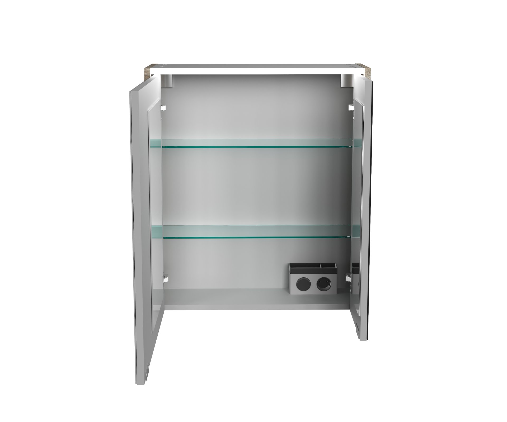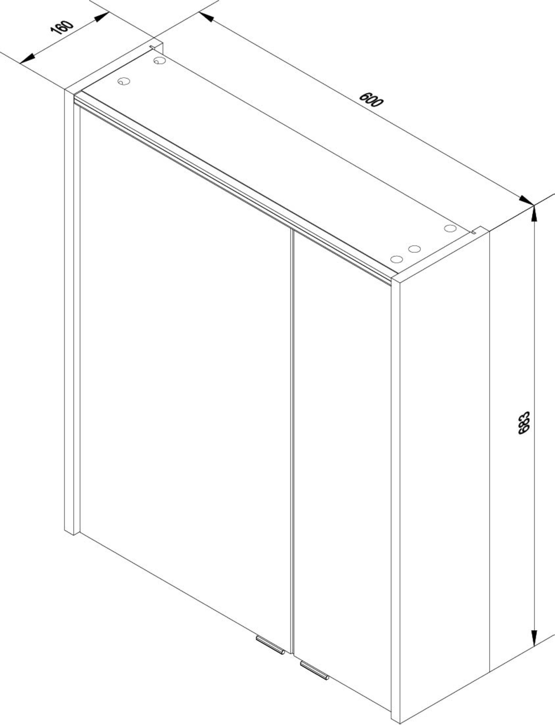 - Besonderheit: Farbtemperatur Kaltweiß, Softclose, Anschlag der Spiegeltüren frei wählbar, Rückwand silbergrau, Kanten der Spiegeltür Alu-Optik