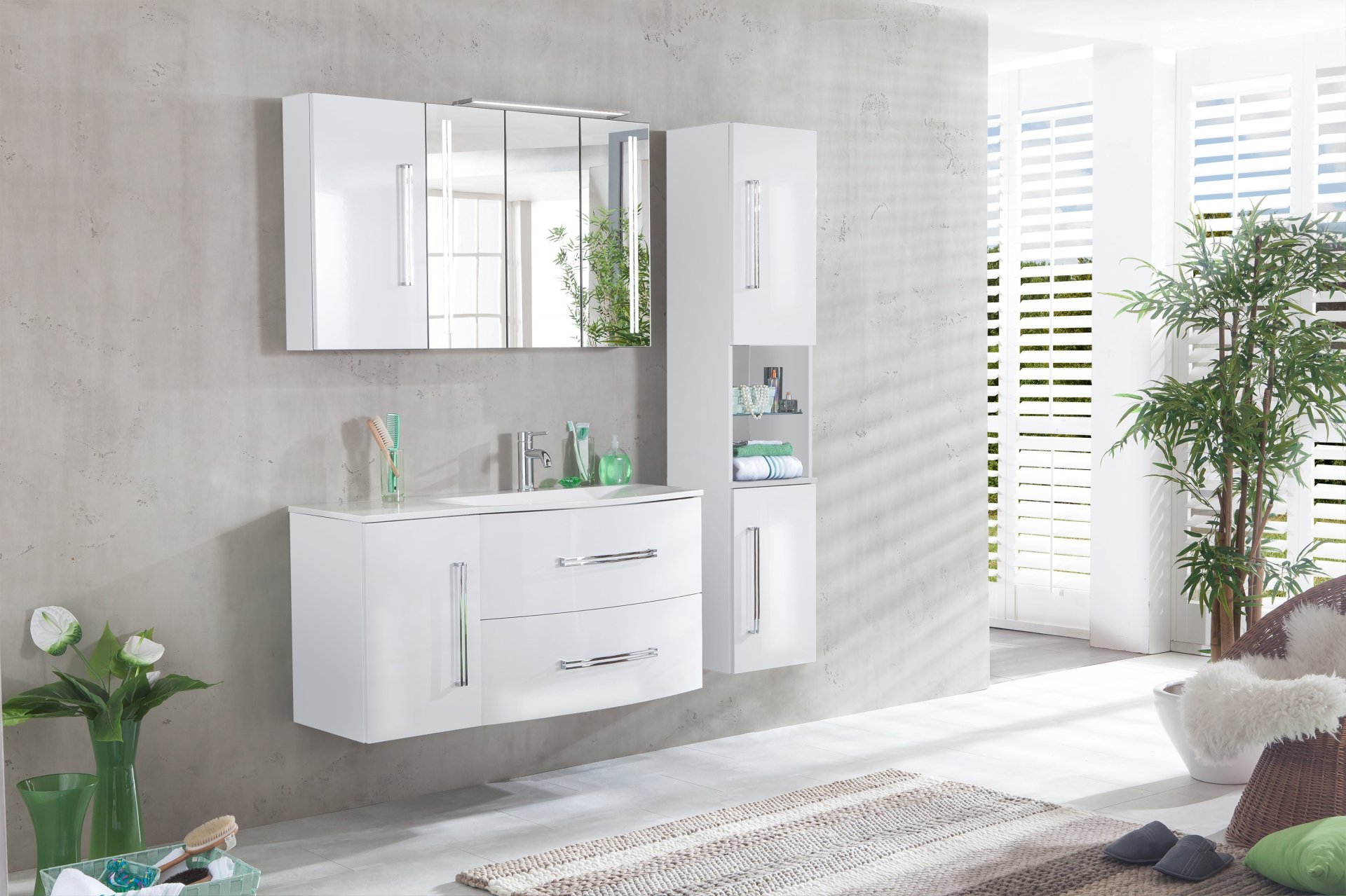 Montagehinweis: Für die Montage des Waschbeckens werden 2 Komponente benötigt: ein Waschtischunterschrank mit Schubladen oder Türen, sowie ein Waschtisch-Unterbauschrank. Bei den Schränken der Serie Lugano kannst Du im Korpus- und Front-Design zwischen glänzendem Weiß und moderner Pinie-Anthrazit-Optik wählen.