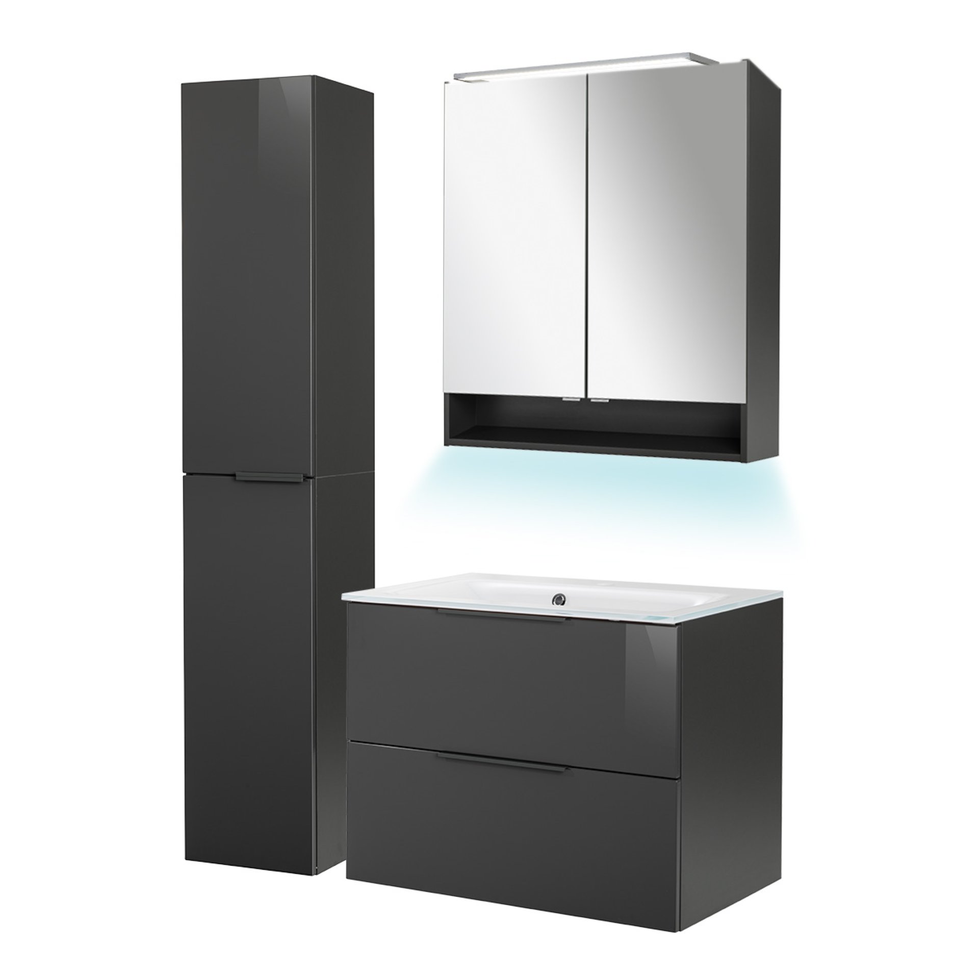 Fackelmann LUNA Badmöbel Set 5-teilig 80 cm breit, Anthrazit, Glas Weiß+Spiegelschrank+Hochschrank