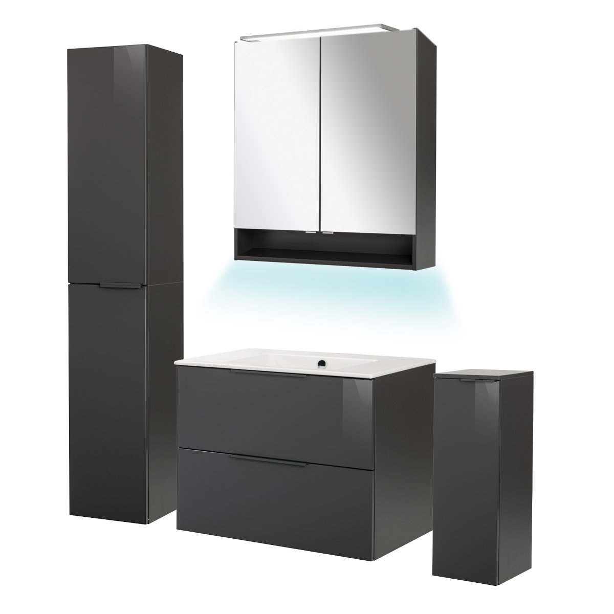 Fackelmann LUNA Badmöbel Set 6-teilig 80 cm breit, Anthrazit, Keramik+Spiegelschrank+2 Badschränke