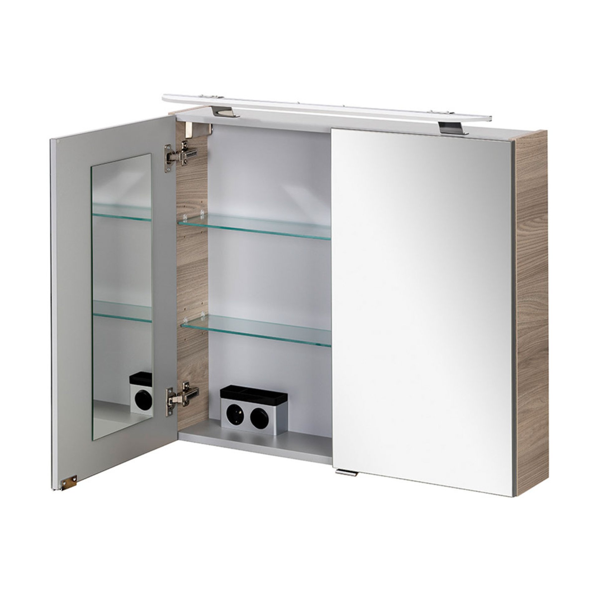 - Ausstattung: 2 Türen, 2 Glaseinlegeböden, 1 LED-Aufsatzleuchte (Höhe: 4,5 cm), 7 Watt, Tageslichtweiß, Steckdose mit Schalter