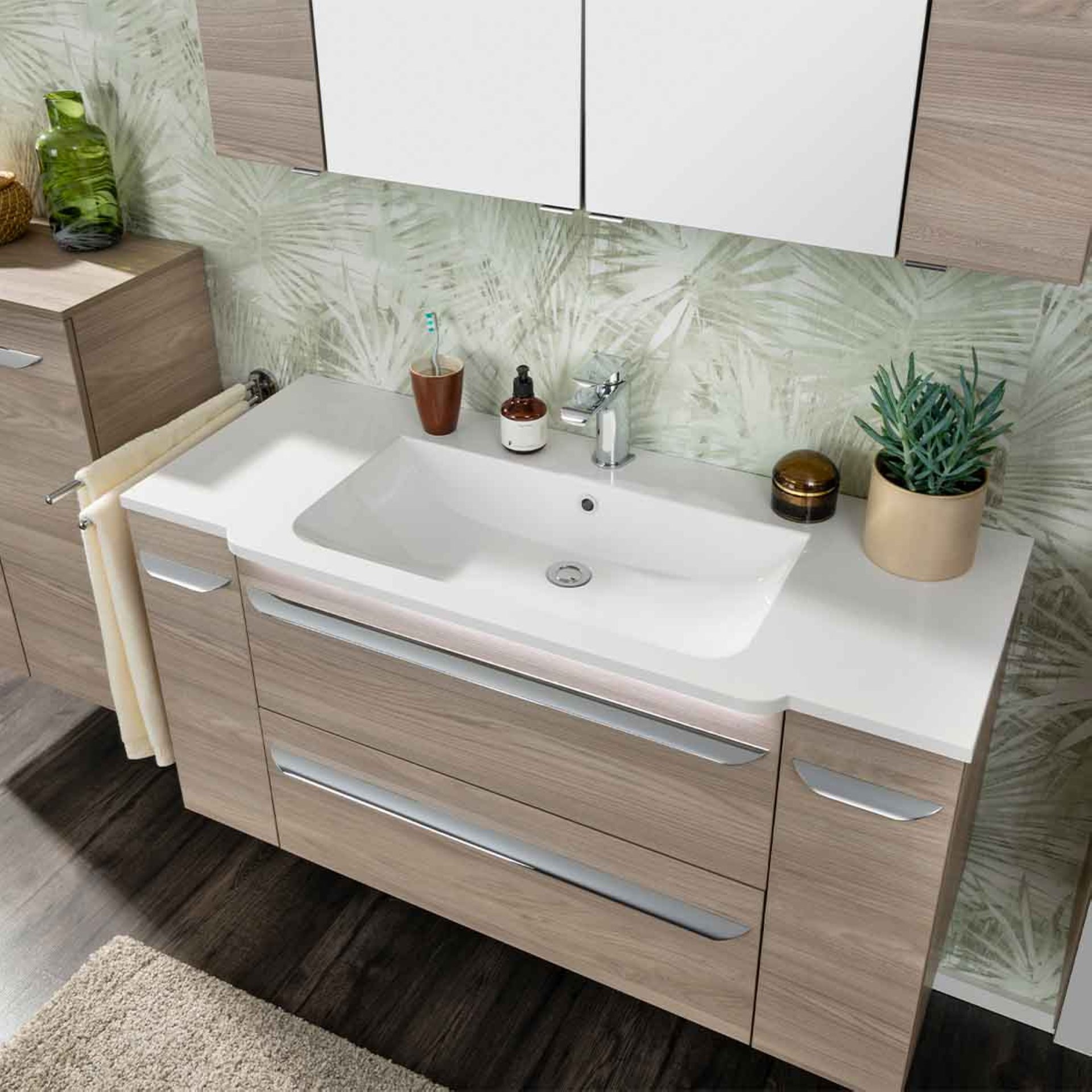 Das 7-teilige Set aus der Serie LUXOR von Fackelmann für große Bäder oder Familienbäder lässt keine Wünsche offen. LED-Spiegelschrank mit LED Aufsatzleuchte, Waschbecken mit tiefer Waschmulde und einer Ablage rechts und links, ein geräumiger Waschtischunterschrank, zwei Hängeschränke und zwei Unterschränke, einer mit Apothekerauszug und der andere mit linkem Türanschlag - alles perfekt aufeinander abgestimmt! Front und Korpus des Waschtischunterschranks und der Schränke sind im Design Steinesche gehalten. Dieser hellbraue Farbton mit seinen dunklen Nuancen in der Maserung lässt den verchromten Griff eindrucksvoll zur Geltung kommen. Der handschmeichelnde Griff zieht sich über die gesamte Breite des Waschtischunterschranks. Dadurch lassen sich die beiden Schubladen leicht öffnen. Im Inneren befindet sich ausreichend Stauraum für viele Badaccessoires. Als Besonderheit ist das Orga-Set in der oberen Schublade zu erwähnen. Hier finden Haarbürsten, Schmink- oder Rasierutensilien und andere Kosmetikartikel einen geeigneten Platz und sind immer griffbereit. Selbstverständlich sind die zwei Schubladen mit einem modernen Soft-Close System ausgestattet. Passgenau auf dem Unterschrank sitzt das 120 cm breite, weiße Gussmarmorwaschbecken mit Ablageflächen rechts und links. Passend dazu zwei Unterschränke. Auf der linken Seite mit Tür und auf der rechten mit Apothekerauszug. Möchtest Du Deinem 7-teiligen Badmöbelset ein wenig mehr Exklusivität verleihen, dann empfehlen wir Dir für Dein Waschbecken das ConturaLight (Art.Nr. 80109 nicht im Lieferumfang enthalten). Es ist kinderleicht zu installieren und illuminiert Deinen Waschtisch auf eindrucksvolle Weise. Ein Sensor schaltet das Licht automatisch an und aus. Kein Stromanschluss ist notwendig, denn es arbeitet mit Batterien. Die Krönung des Badmöbel Sets ist der LED-Spiegelschrank und seinen zwei Hängeschränken. Der 80 cm breite Spiegelschrank ist mit einer LED Aufsatzleuchte ausgerüstet, die ausreichend Licht für das tägliche Pflegeritual bietet. Beide Spiegeltüren sind innen verspiegelt und gestatten bei geöffneten Türen eine Betrachtung mit 3-D Effekt. Badmöbel von Fackelmann werden mit viel Liebe zum Detail in Deutschland hergestellt. Das Fackelmann LUXOR Badmöbel Set 7-teilig 120 cm, Braun + LED-Spiegelschrank + Unterschränke + Hängeschränke ist vormontiert und damit schnell und einfach in Deinem Badezimmer integriert.