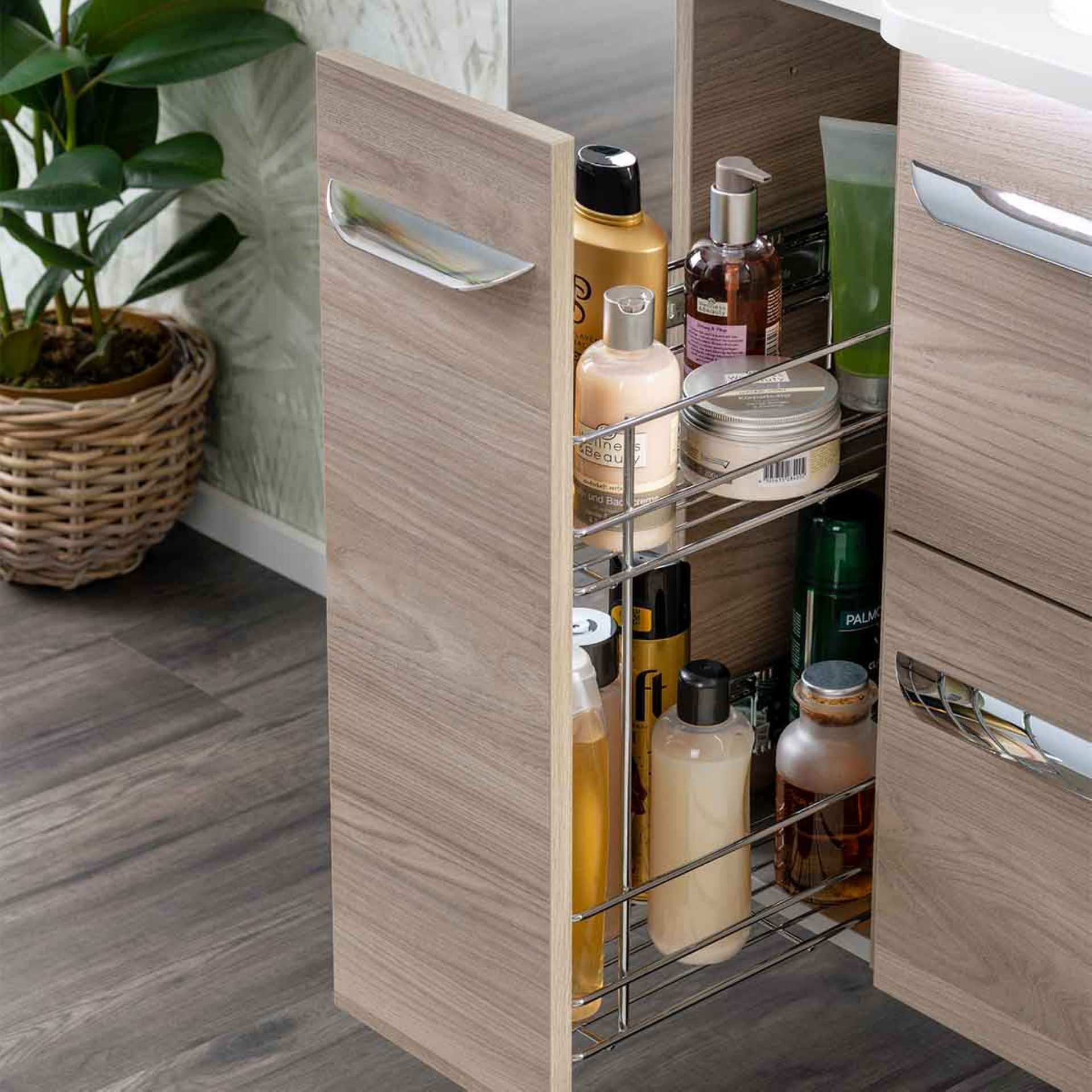 - Ausstattung: 1 Auszug mit 2 Körben, Querteile und Rückwand silbergrau, als Waschtisch-Unterschrank Ergänzung