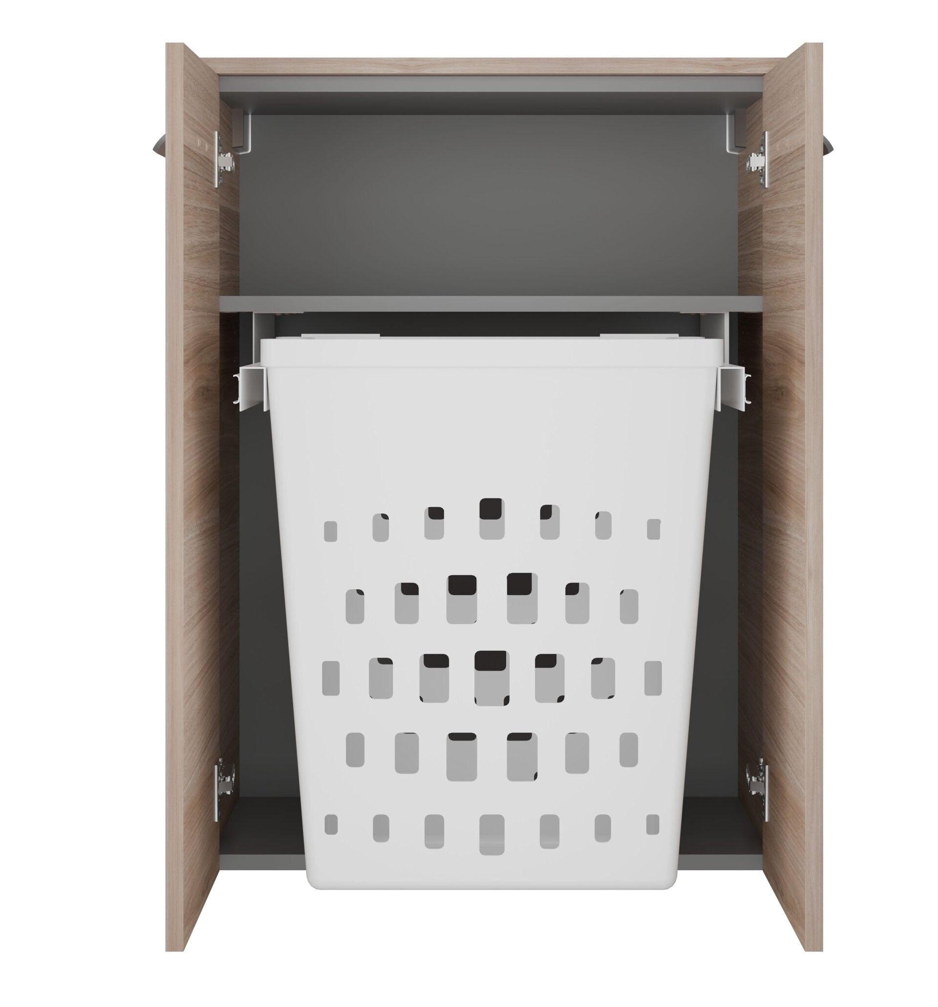 - Besonderheit: Wäschekorb mit Auszug, Abdeckplatte in Korpusfarbe, gedämpfte Scharniere