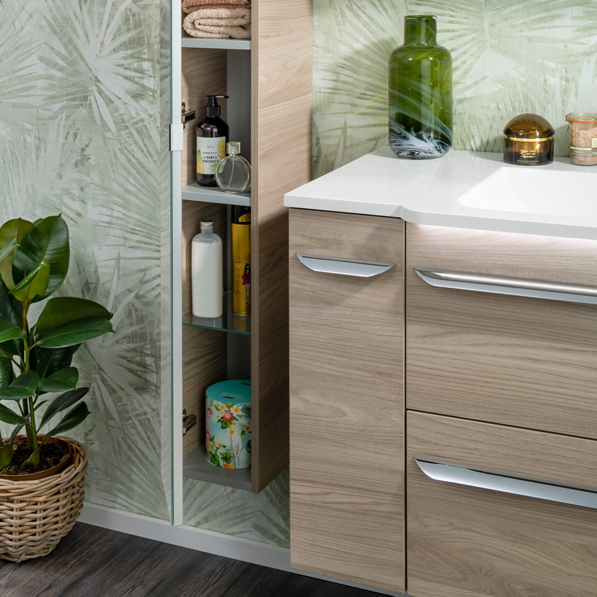 Luxuriös! Der verspiegelte Hochschrank aus der Serie LUXOR in Design Steinesche von Fackelmann bringt Glanz und durch seinen Korpus in Holzoptik Natürlichkeit in Dein Badezimmer. Auffallend und ein beeindruckender Blickfang gleichzeitig, ist die verspiegelte Tür des Hochschranks mit linkem Türanschlag. Dank gedämpfter Scharniere schließt sie sanft. Eine sehr durchdachte Aufteilung im Inneren des Möbels, mit zwei Glaseinlegeböden und zwei festen Böden, sorgt für Ordnung im Schrank. Die Serie LUXOR punktet durch das Ausbaukonzept: Für alle, die sich mehr Spiegelfläche im Bad wünschen, bildet der verspiegelte Hochschrank die ideale Ergänzung zum LED-Spiegelschrank LUXOR (Art.Nr. 79891). Zwei Hochschränke nebeneinander können als praktischer Ganzkörperspiegel mit einer Breite von 40 cm genutzt werden. Ein positiver Nebeneffekt: sie bieten zusätzlichen Stauraum. Mit viel Liebe zum Detail wird der Schrank für Dich in Deutschland hergestellt und vormontiert. Damit ist der Fackelmann LUXOR Spiegel Hochschrank 20 cm, Braun hell, links ganz leicht in Deinem neuen Badezimmer integriert.