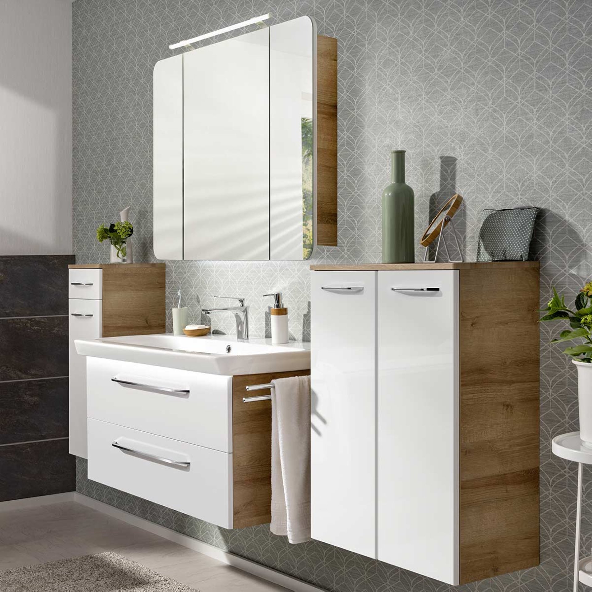 Du suchst nach zusätzlichem Stauraum für Dein neues Badezimmer? Dann hast Du mit dem 82 cm hohen Midischrank mit Schublade genau das Richtige gefunden. Das 4-teilige Badmöbel-Set in 100 cm Breite aus der Serie MILANO von Fackelmann bietet Dir diesen Luxus. Ein Korpus, der Asteiche nachempfunden, bildet mit der weißen strahlenden Front des Waschbeckenunterschranks in Verbindung mit dem weißen edlen Keramikwaschbecken ein wunderschönes Ensemble. Zwei Schubladen laden zur Ordnung im Bad ein. Jede Menge Stauraum für Badutensilien, Handtücher und Co. Dank des Soft-Close-Systems lassen sich beide Schubladen mit den chromglänzenden Griffen sanft schließen. Für zusätzlichen Stauraum sorgt der 82 cm hohe Midischrank. Der Schrank ist mit einer Tür und einer Schublade ausgestattet. Im Inneren des Badschranks befinden sich zwei Glaseinlegeböden, die für eine strukturierte Aufteilung sorgen. Das Waschbecken kannst Du mit dem ConturaLight (Art.Nr. 80119) - nicht im Lieferumfang enthalten - eindrucksvoll illuminieren. Oberhalb Deines Waschplatzes bildet der Spiegelschrank mit drehbarer Aufsatzleuchte den gekrönten Abschluss Deines schönen Ensembles. Der Korpus des Spiegelschranks ist von der Fläche kleiner als die Spiegelfront. Dadurch scheint der Spiegel zu schweben. Diese Gestaltung hat den Designern erlaubt auf Griffe zu verzichten, was den schwebenden Effekt zusätzlich verstärkt. Möbel von Fackelmann werden mit viel Liebe zum Detail in Deutschland gefertigt. Dein Fackelmann MILANO Badmöbel Set 4-teilig, 100 cm, Braun hell/Weiß, Keramik, LED-Spiegelschrank + Midischrank ist zerlegt und wird mit einer leicht verständlichen Aufbauanleitung direkt zu Dir nach Hause geliefert.
