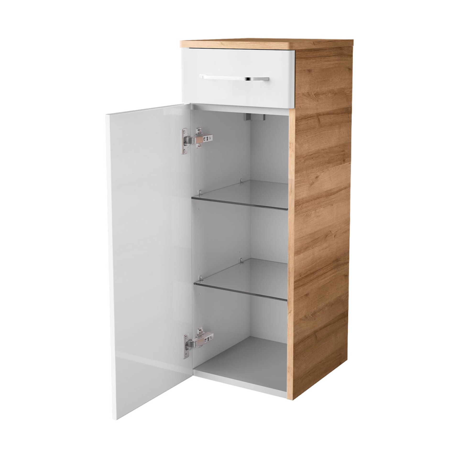 - Ausstattung: 1 Tür, 1 Schublade, 2 Glaseinlegeböden