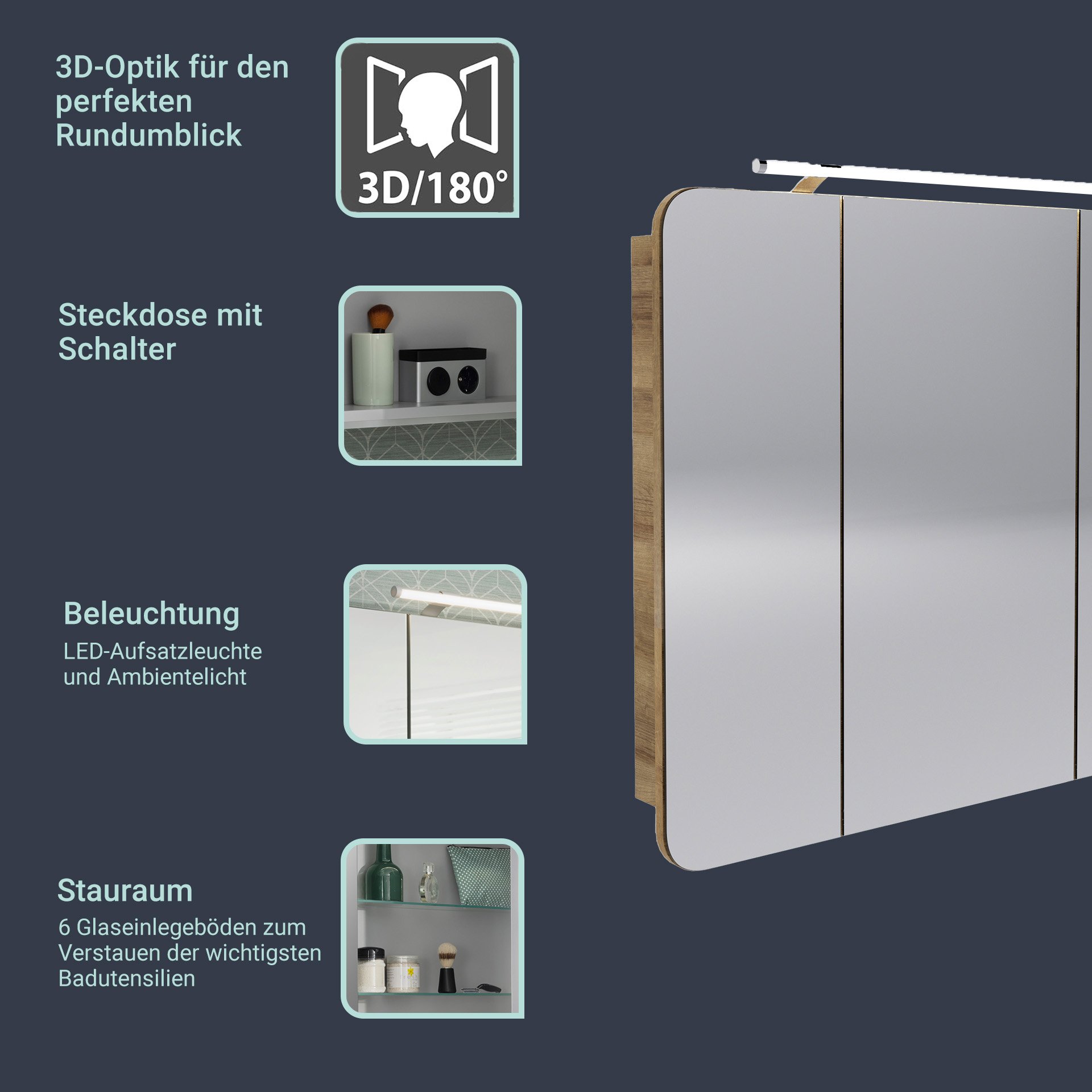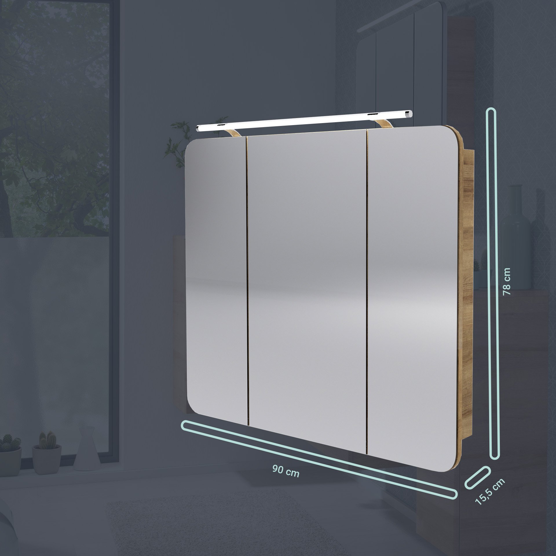 Fackelmann MILANO Badmöbel Set 4-teilig 88 cm breit, Braun hell, Waschbecken Keramik Weiß + LED Spiegelschrank + Hochschrank