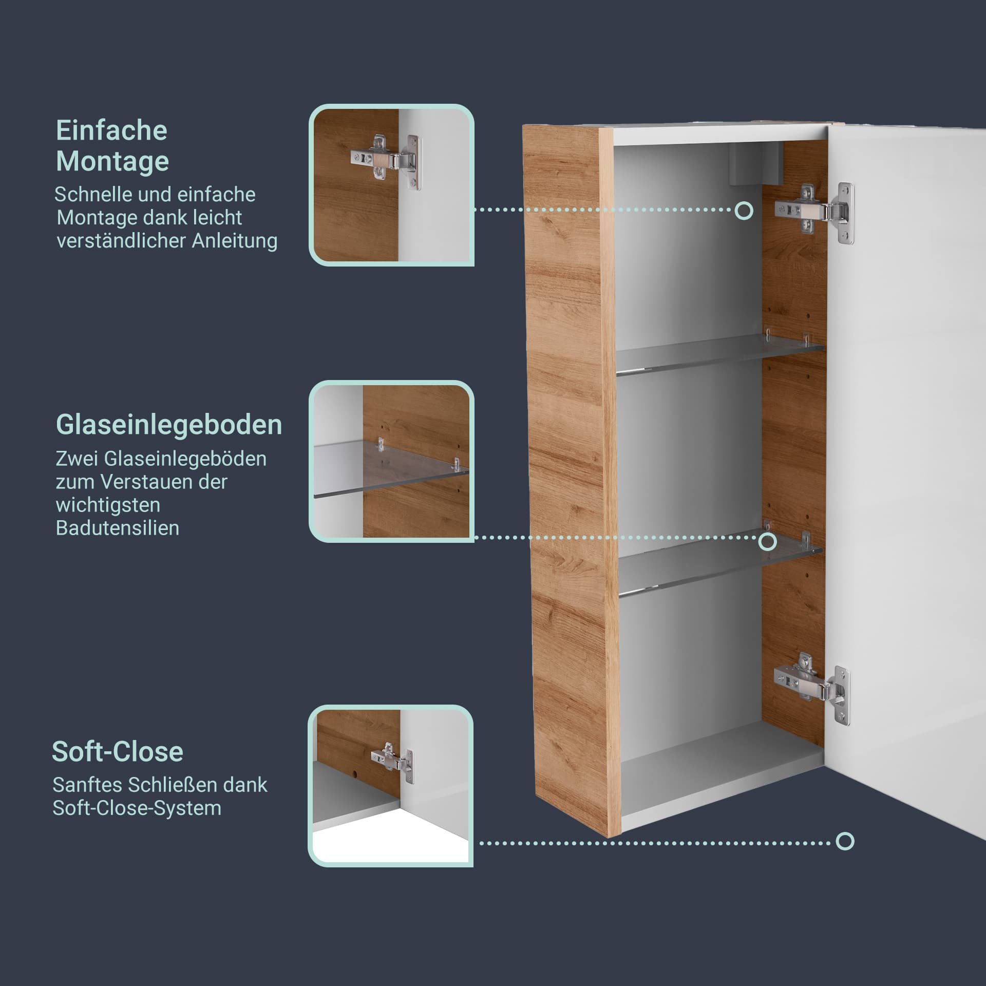 Der Hängeschrank MILANO von Fackelmann fügt sich auf Grund seines schlichten Designs harmonisch in jedes Badezimmer ein. Die Farbkombination Braun und Weiß gehört zu den beliebtesten Varianten bei der Badeinrichtung. Der hellbraune Korpus bei diesem Badschrank besticht zudem durch Holzstrukturen in Eichen-Optik. So bringt der tiefenreduzierte Schrank (nur 15 cm) Natürlichkeit in die Badeinrichtung. Die Tür mit frei wählbarem Türanschlag lässt sich dank der gedämpften Scharniere sanft schließen. Der Fackelmann MILANO Hängeschrank 30 cm, Braun hell/Weiß wird zerlegt und mit einer leicht verständlichen Montageanleitung geliefert.