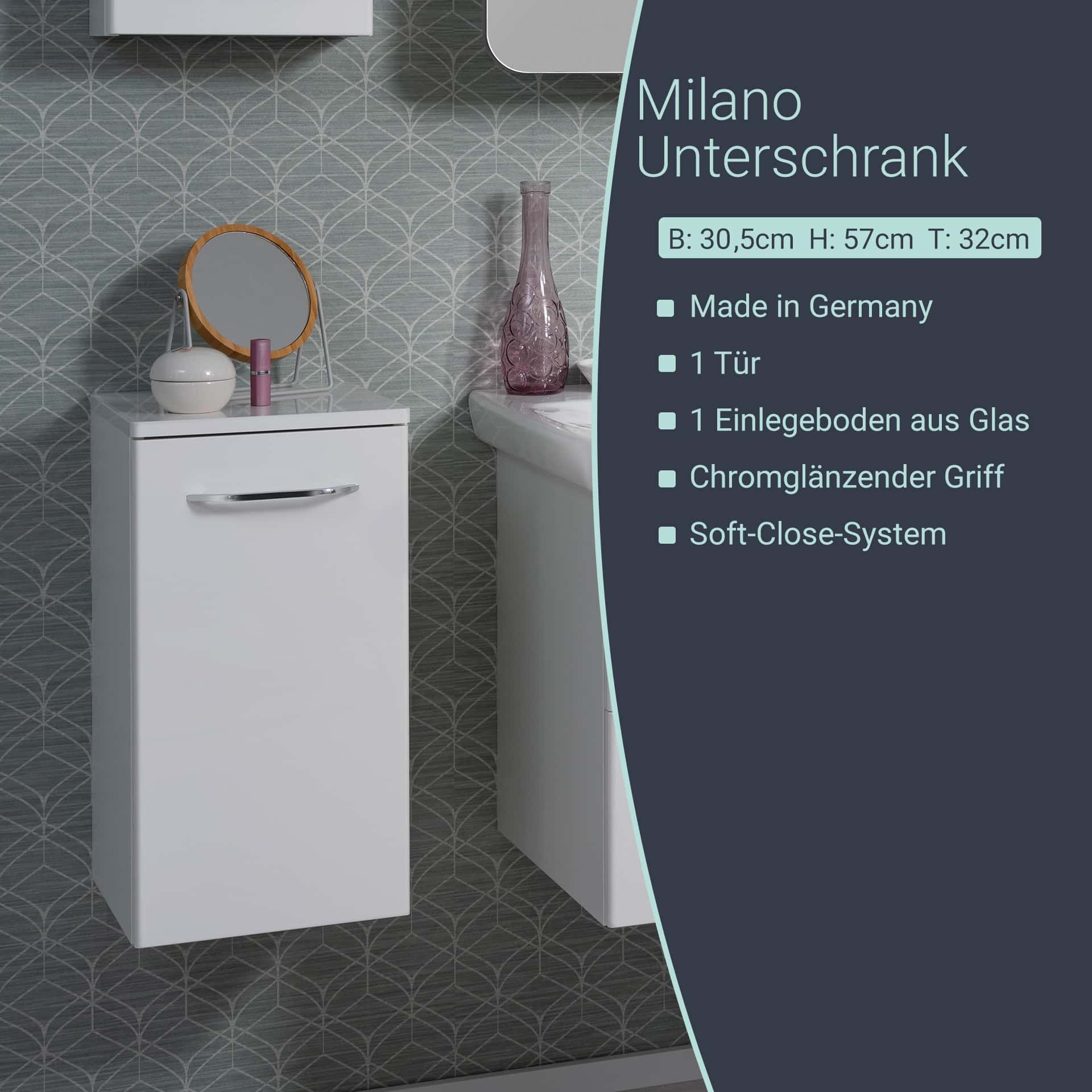 Der Unterschrank aus der Serie MILANO von Fackelmann fügt sich auf Grund seines schlichten Designs harmonisch in jedes Badezimmer ein. Korpus und Front sind im klassischen Weiß gehalten, der beliebtesten Farbe für Badmöbel. So bringt der Schrank Helligkeit in die Badeinrichtung. Die Tür mit frei wählbarem Türanschlag lässt sich dank der gedämpften Scharniere sanft schließen. Möbel von Fackelmann werden mit viel Liebe zum Detail in Deutschland gefertigt. Dein Fackelmann MILANO Unterschrank 30 cm, Weiß ist zerlegtund wird mit einer leicht verständlichen Aufbauanleitung direkt zu Dir nach Hause geliefert.