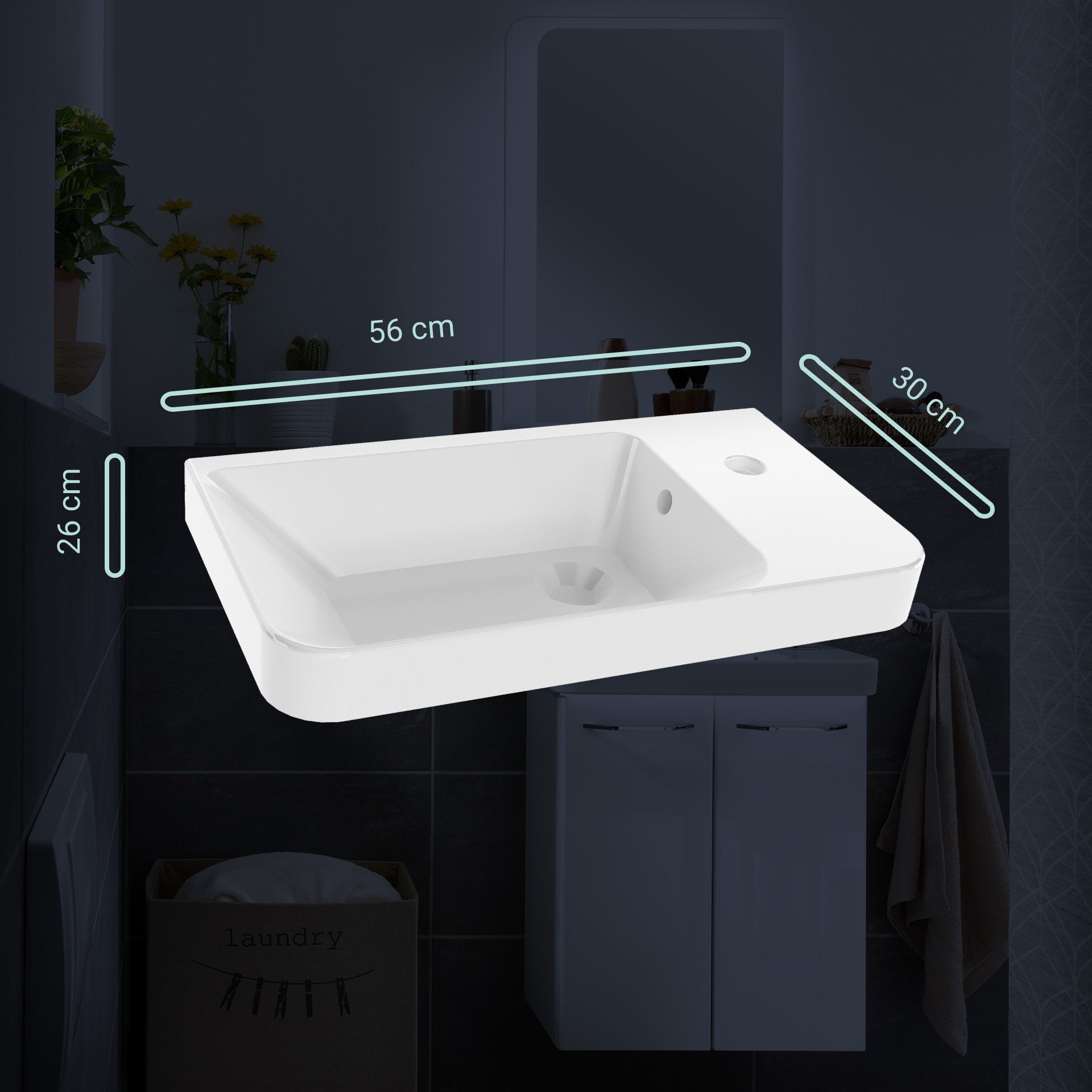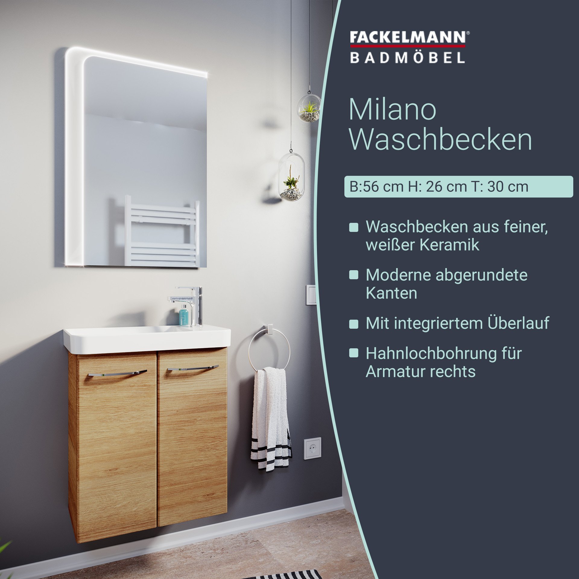Das weiße Waschbecken MILANO von Fackelmann hat eine rechteckige Form mit gesofteten Kanten. Die Waschmulde befindet sich auf der linken Seite und auf der rechten Seite ist die Aussparung für die Armatur. Durch seine Größe eignet sich dieser Keramik-Waschtisch mit integriertem Überlauf hervorragend für das kleine Bad und Gäste-WC. Das Keramikbecken passt optimal auf die Mini-Waschtisch-Unterschränke aus der Serie MILANO (Art.Nr. 84332, 84333, 84335) mit einer Breite von 52 cm. Mit der LED-Beleuchtung ConturaLight (Art.Nr. 82398) lassen sich das Fackelmann MILANO Waschbecken 55 cm aus Keramik, links, Weiß und der Waschbeckenunterschrank zudem stilvoll indirekt beleuchten. Der Schrank sowie die Beleuchtung sind nicht im Lieferumfang enthalten und können separat im BadeDu-Shop bestellt werden.