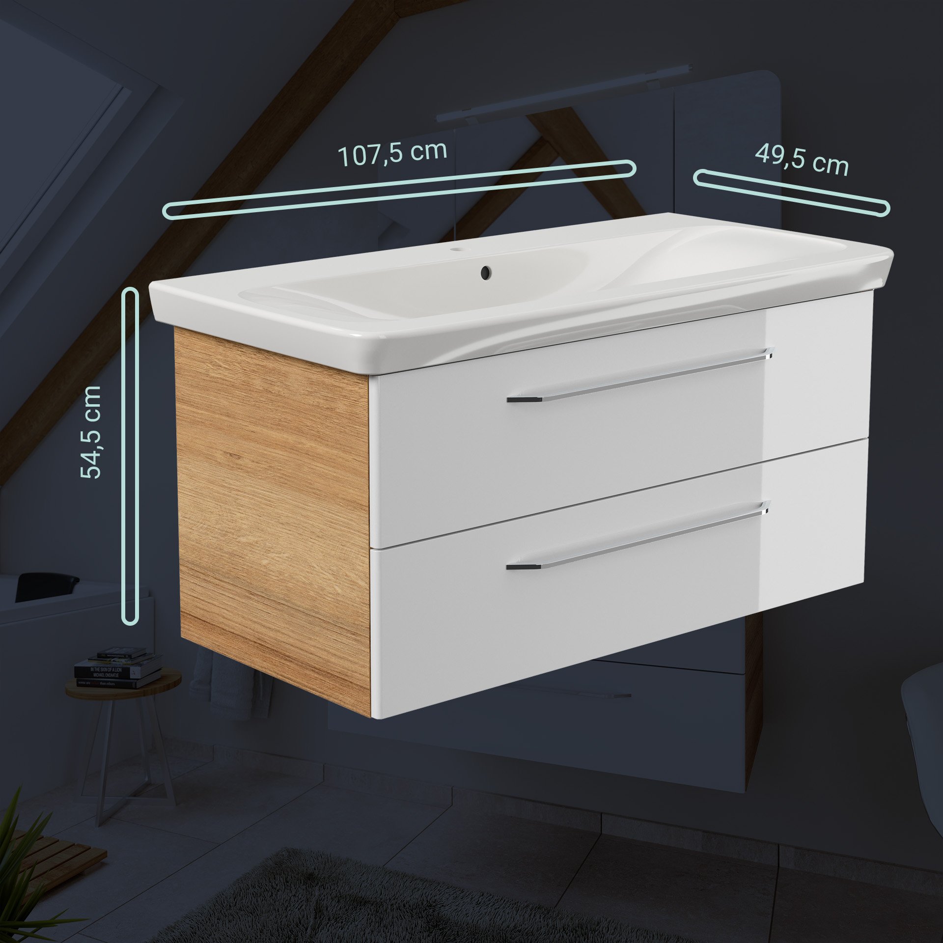 Fackelmann MILANO Waschbecken mit Unterschrank 107 cm breit, Weiß/Braun hell, Waschbecken Keramik Weiß