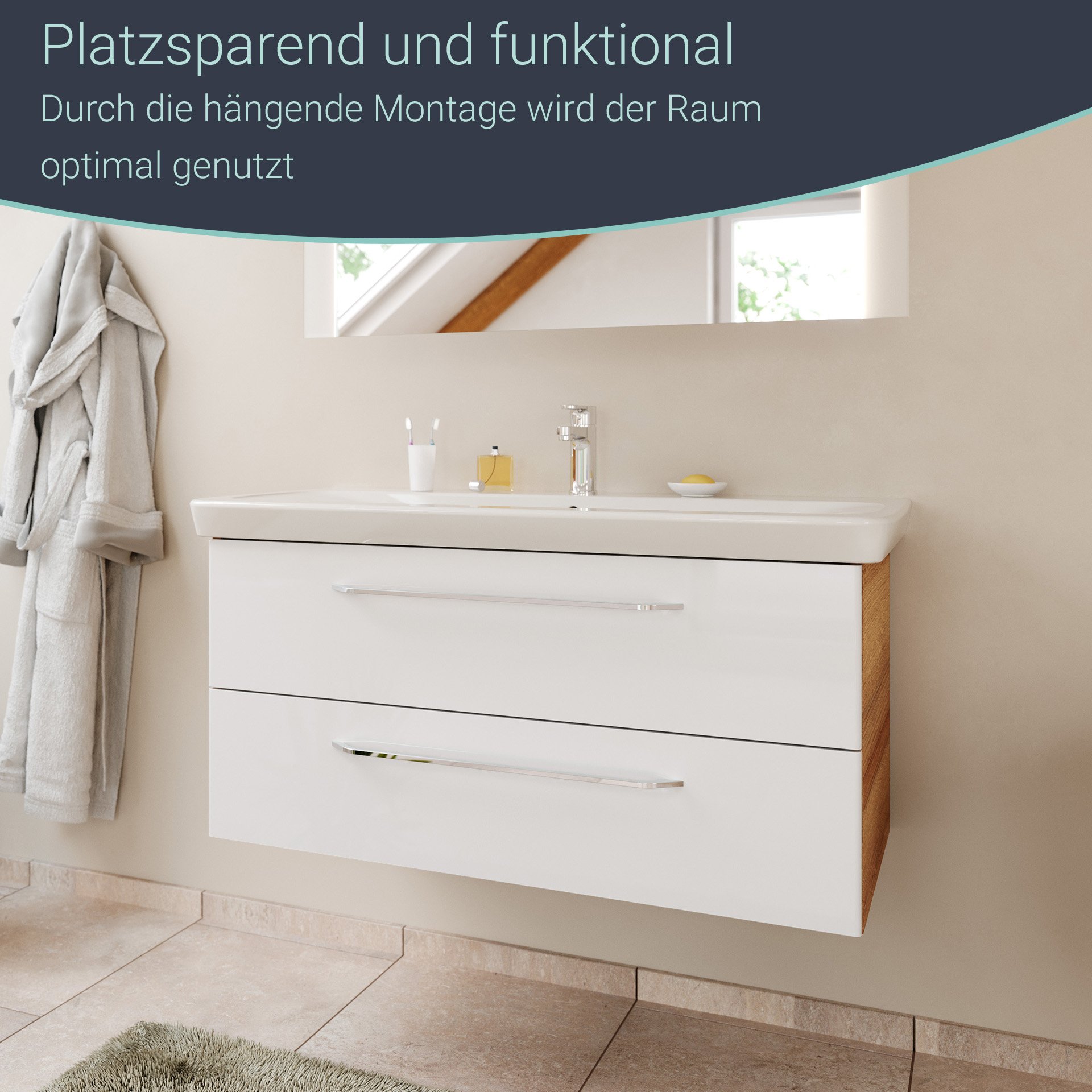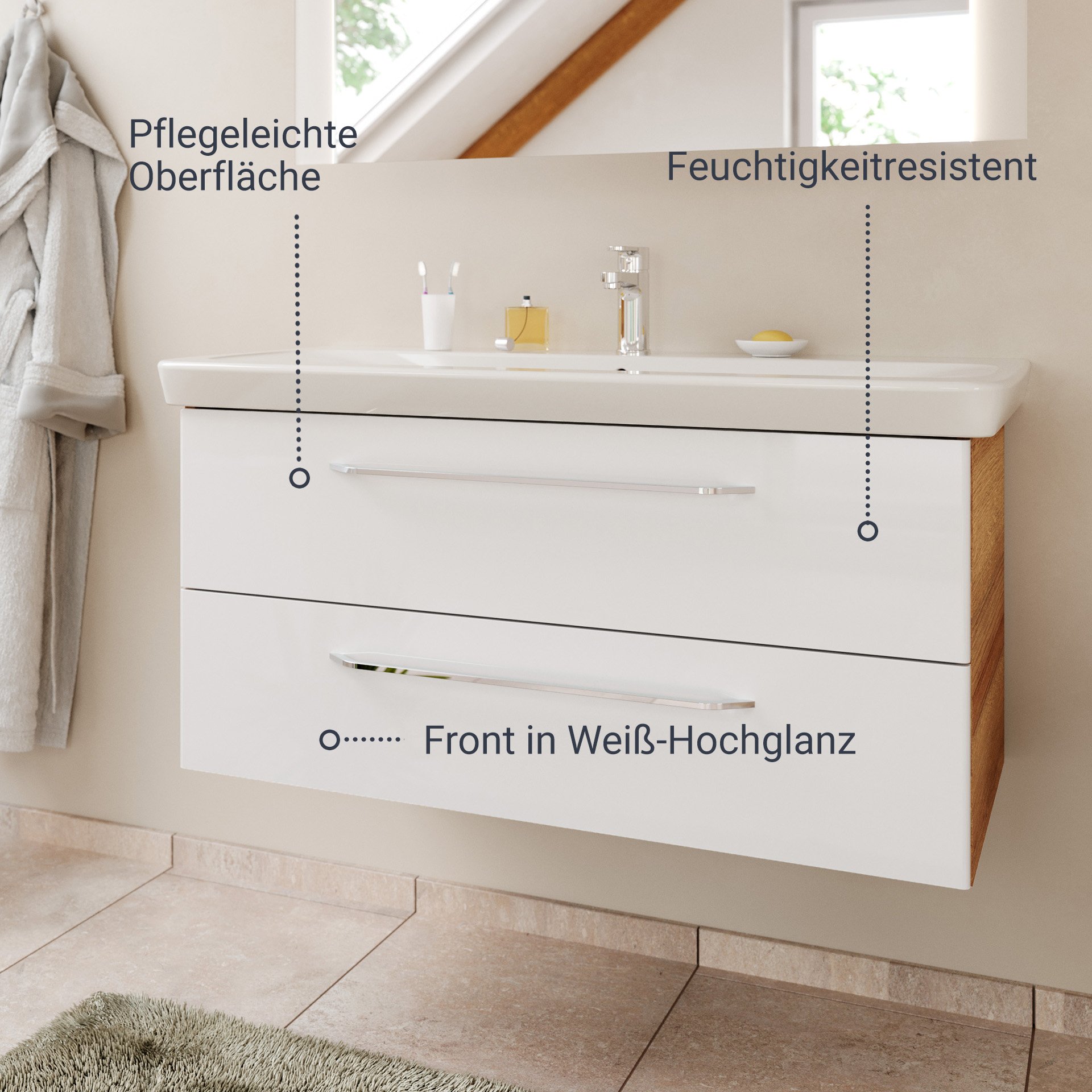 Hol Dir mediterranes Flair ins Badezimmer – mit dem 2-teiligen Badmöbel-Set aus der Serie MILANO von Fackelmann. Der Waschbeckenunterschrank mit einer Breite von 100 cm passt optimal in Dein großes Bad. Hier trifft der Farbton von natürlicher Eiche auf eine weiß-glänzende Front. Zwei Schubladen bieten jede Menge Stauraum für Badutensilien, Handtücher und Co. und sorgen für perfekte Ordnung. Dank des Soft-Close-Systems lassen sich beide Schubladen sanft schließen. Chromglänzende Griffe heben die Hochwertigkeit des Schranks hervor. Besonders stilvoll ist der Design-Waschtisch aus weißer Keramik. Eine tiefe Waschmulde lässt Wasserspritzer da, wo sie hingehören. Die Möbel von Fackelmann werden mit viel Liebe zum Detail in Deutschland gefertigt. Eine leicht verständliche Aufbauanleitung hilft Dir beim Aufbau Deines zerlegten Badmöbel-Sets.