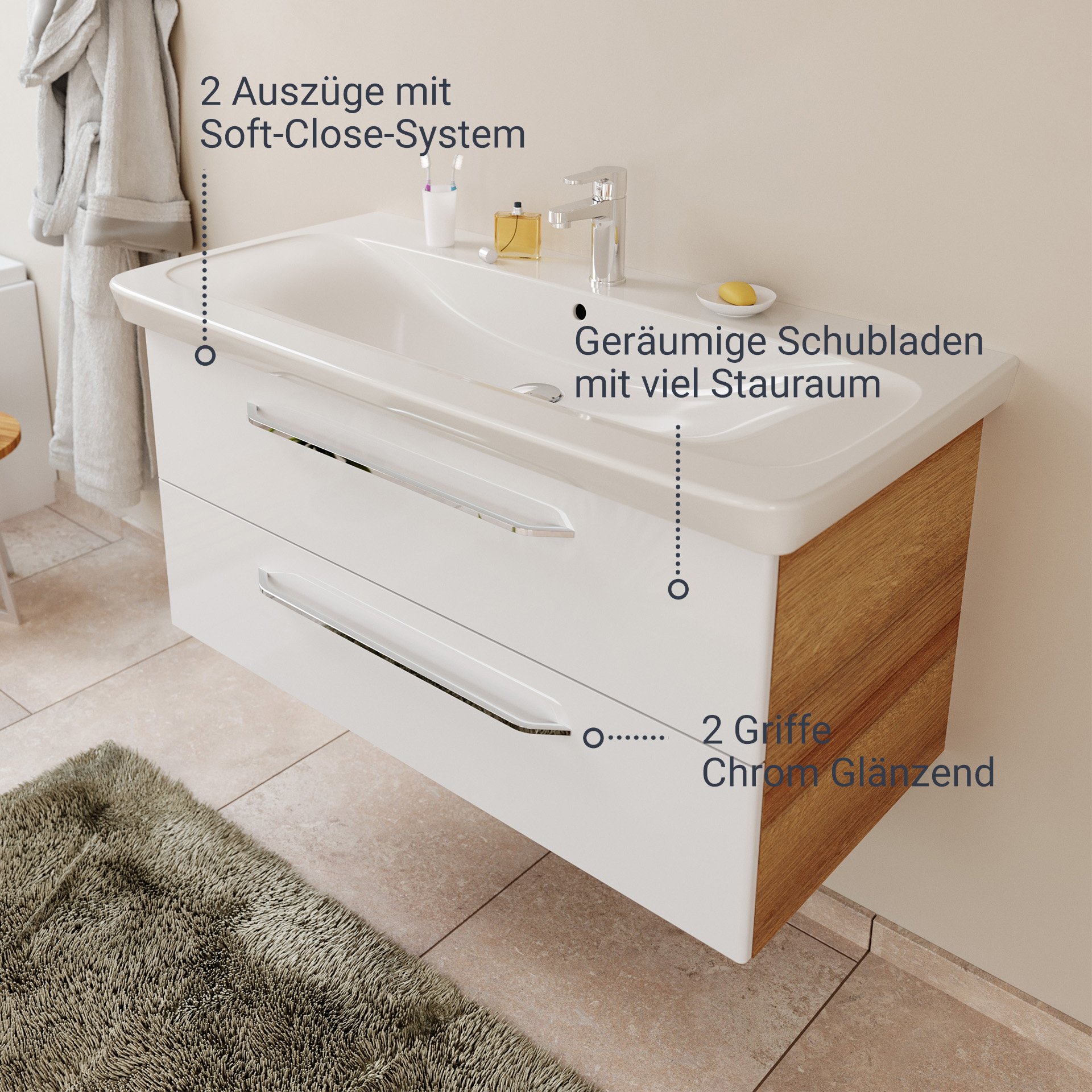 - Ausstattung: 2 Schubladen mit Soft-Close-System, 2 Griffe Chrom glänzend
