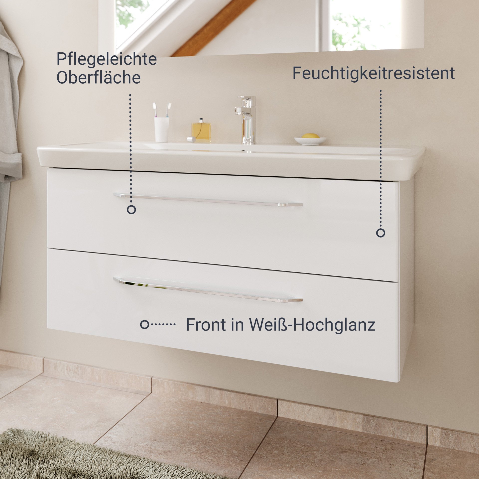 - Ausstattung: 2 Schubladen mit Soft-Close-System, chromglänzende Griffe