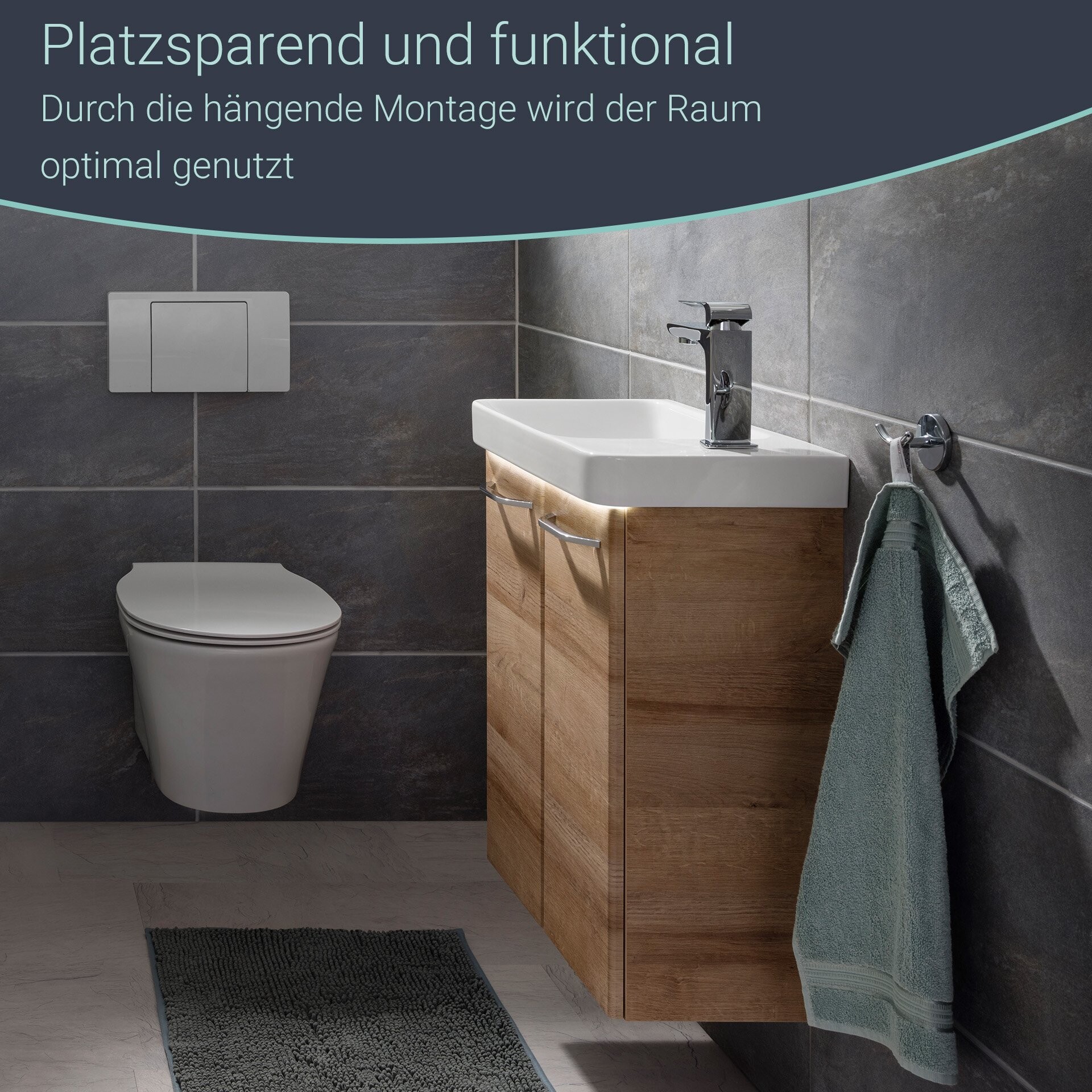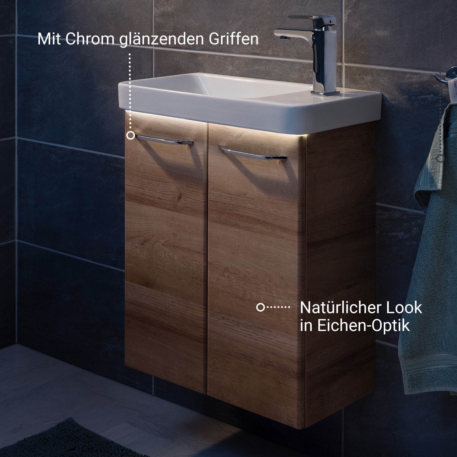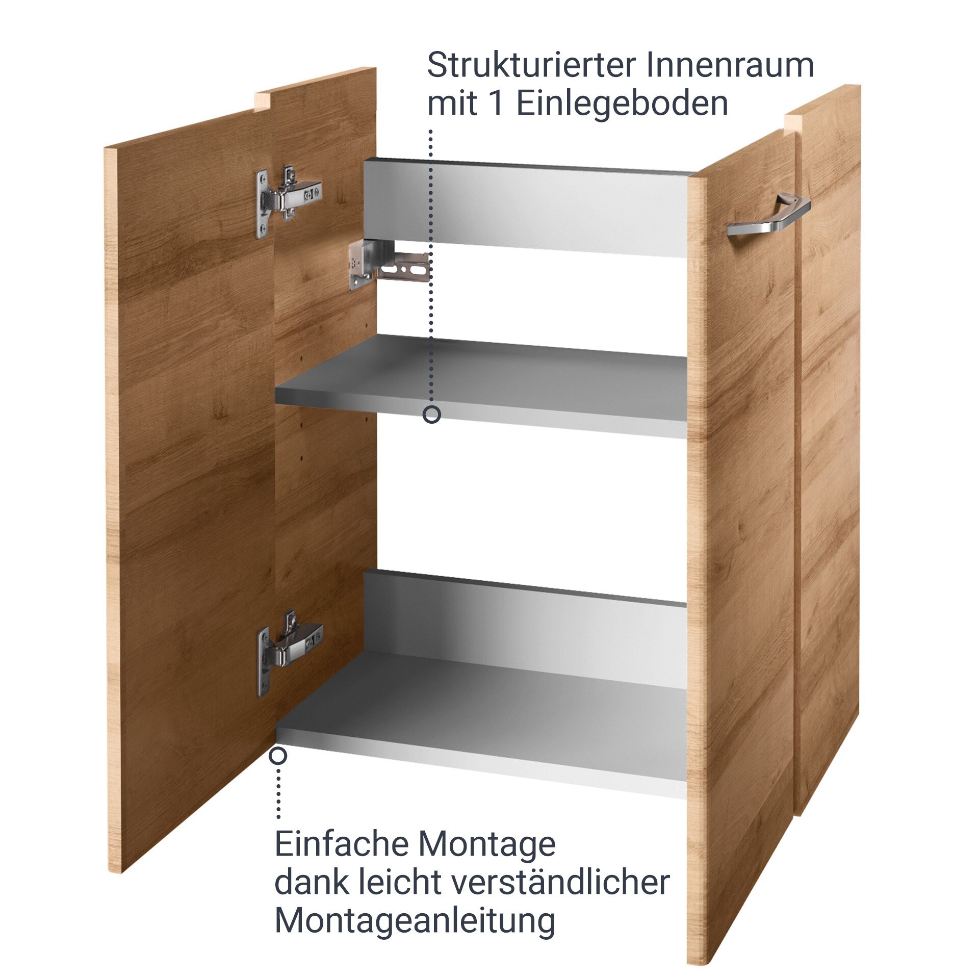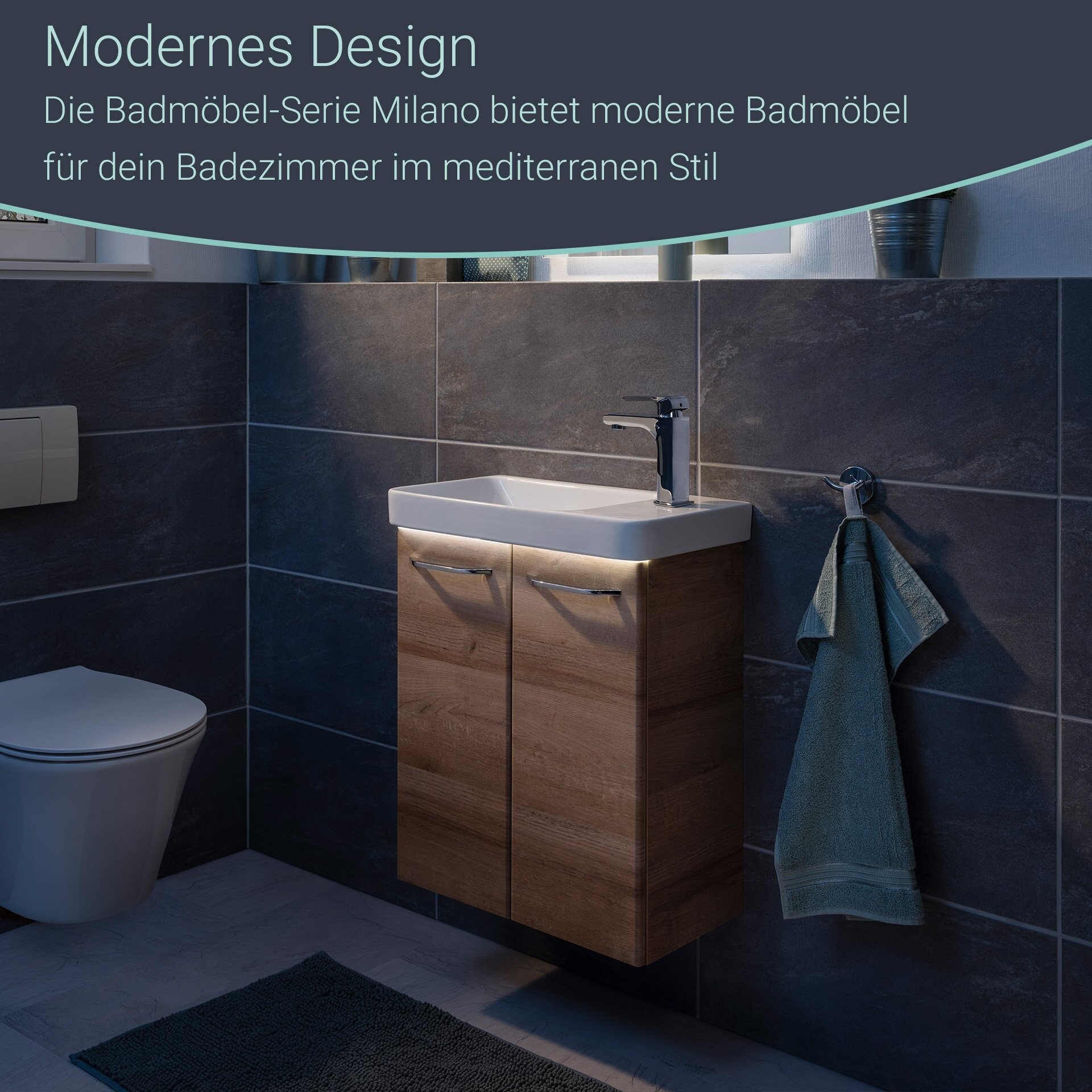 Ein trendiges Braun, der Eiche nachempfunden, kennzeichnet den Mini-Waschtisch-Unterschrank MILANO von Fackelmann. Der 52 cm breite Schrank verfügt über zwei Türen, die dank der gedämpften Scharniere sanft schließen. Auf Grund seiner Größe ist der tiefenreduzierte Fackelmann MILANO Waschbeckenunterschrank 52 cm, Braun hell das ideale Badmöbel für das kleine Bad und Gäste-WCs. Der Badschrank wird zerlegt und mit einer leicht verständlichen Montageanleitung geliefert. Das dazu passende Waschbecken ist aus Keramik (Art.nr. 82396). Es ist nicht im Lieferumfang enthalten und kann separat hier bei BadeDu bestellt werden.