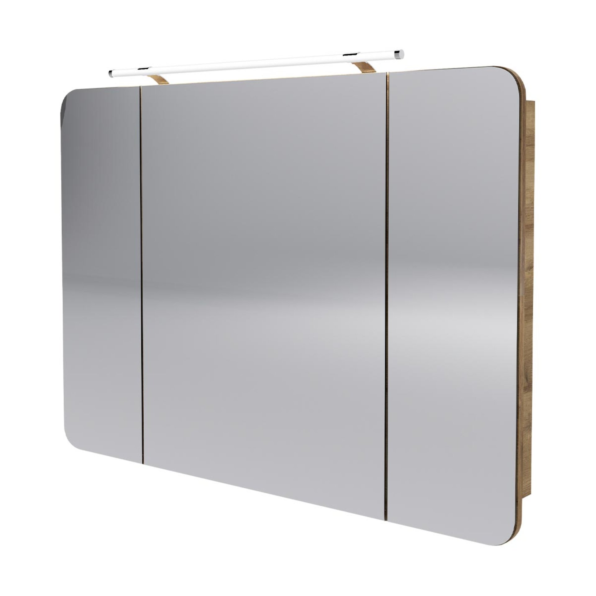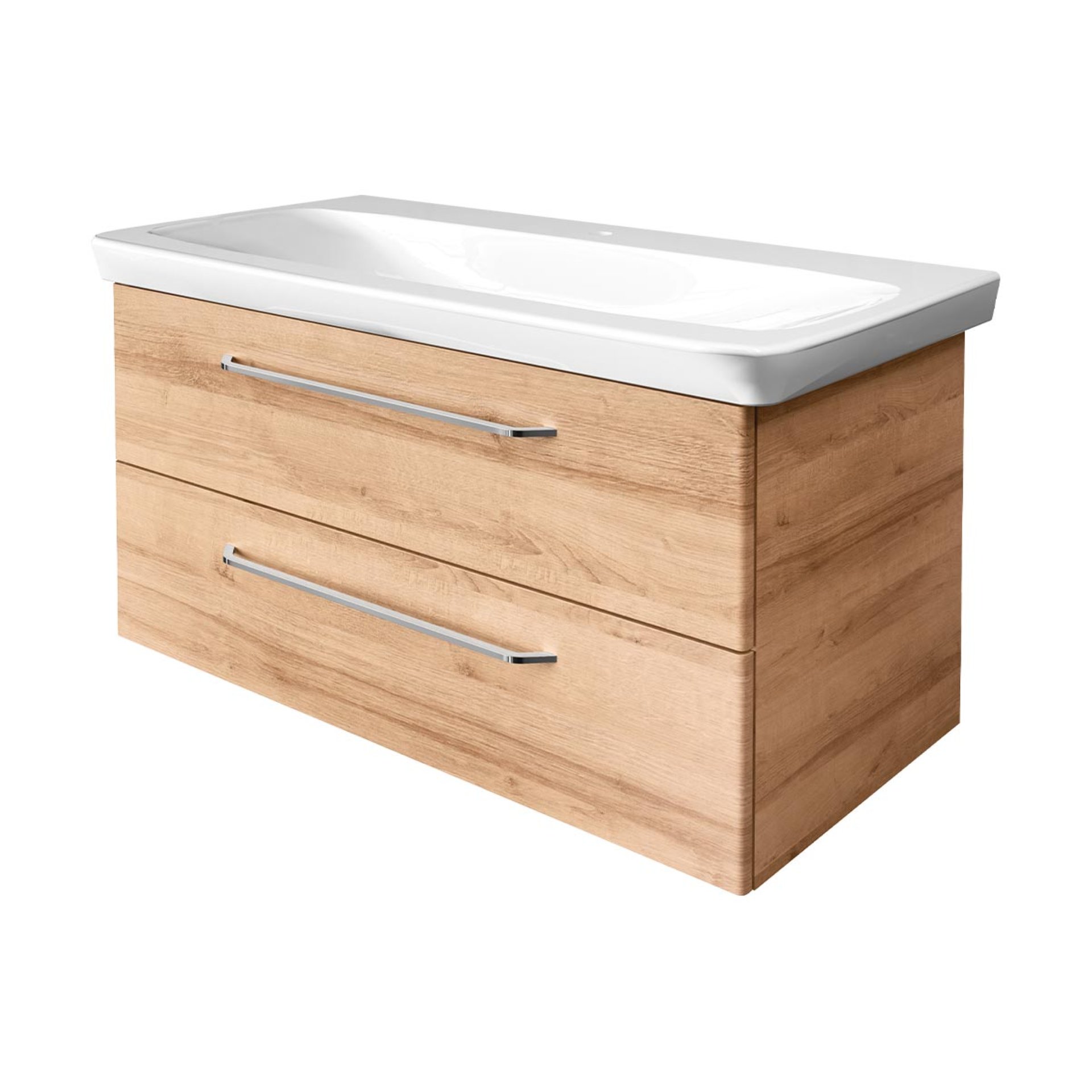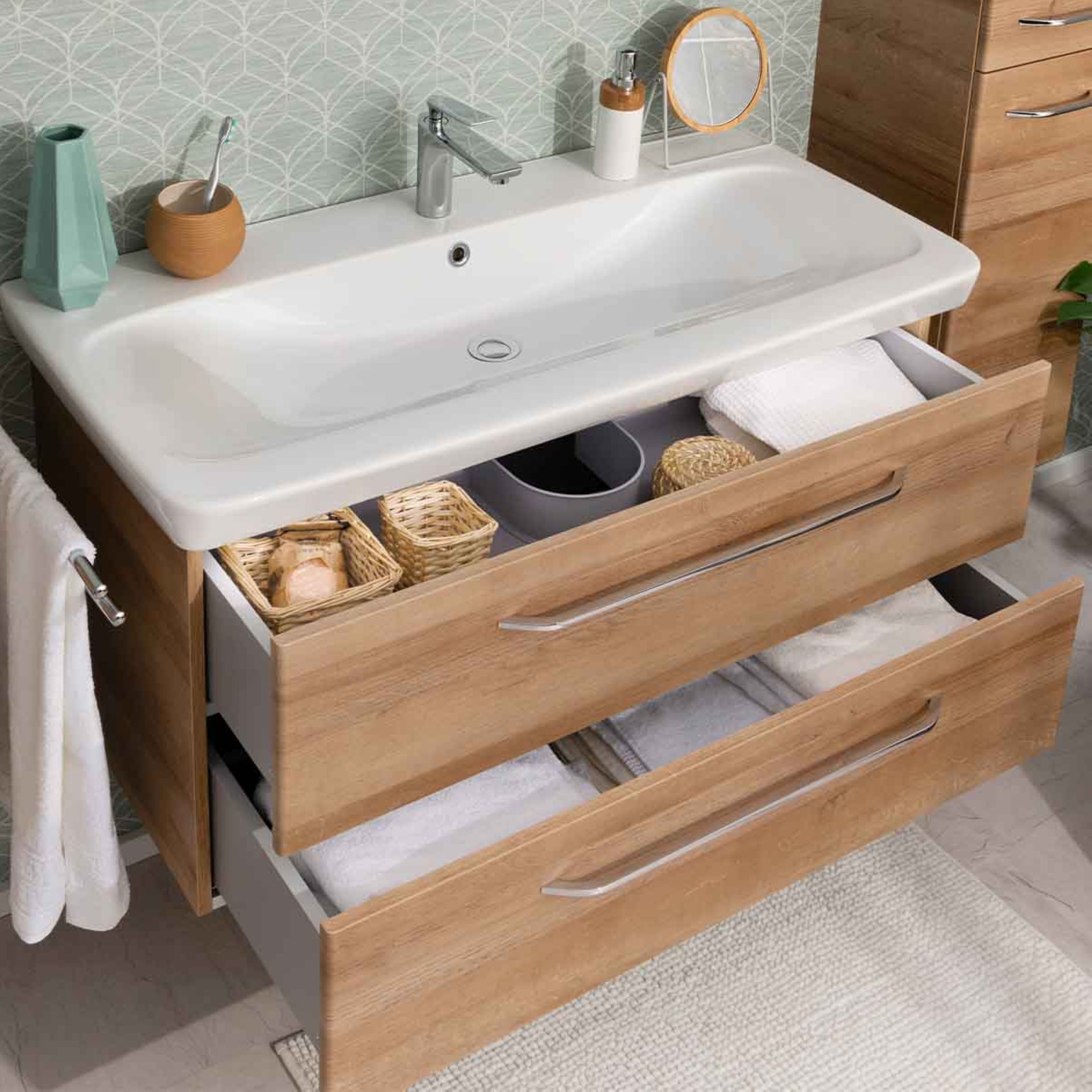 Hol Dir mediterranes Flair ins Badezimmer – mit dem 3-teiligen Badmöbel-Set aus der Serie MILANO von Fackelmann. Der hellbraune Waschbeckenunterschrank mit einer Breite von 100 cm passt optimal in Dein großes Bad. Die natürliche Optik der markanten Eiche bringt Wohnlichkeit in Dein Badezimmer. Zwei Schubladen bieten jede Menge Stauraum für Badutensilien, Handtücher und Co. und sorgen für perfekte Ordnung. Dank des Soft-Close-Systems lassen sich beide Schubladen sanft schließen. Chromglänzende Griffe heben die Hochwertigkeit des Schranks hervor. Besonders stilvoll ist der Design-Waschtisch aus weißer Keramik. Ein echtes Highlight ist der 110 cm breite LED-Spiegelschrank. Die abgerundeten Spiegeltüren harmonieren perfekt mit der Geometrie des Waschbeckens. Für eine entspannte Atmosphäre sorgt eine Ambientebeleuchtung, während eine LED-Aufsatzleuchte den Waschplatz optimal ausleuchtet. Die Möbel von Fackelmann werden mit viel Liebe zum Detail in Deutschland gefertigt. Eine leicht verständliche Aufbauanleitung hilft Dir beim Aufbau Deines zerlegten Badmöbel-Sets.