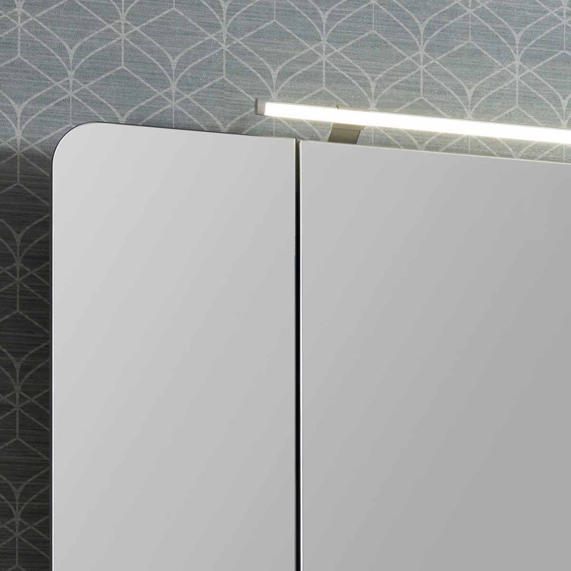 - Besonderheit: bei geöffneten Spiegeltüren 3-D Effekt, drehbare Aufsatzleuchte, grifflose Türen, Kante der Spiegeltüren Alu-Optik, Rückwand und Querteile silbergrau