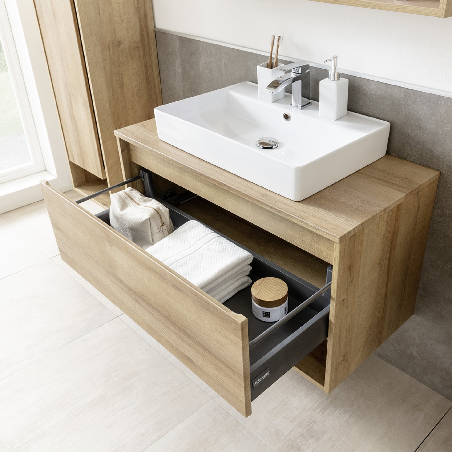 Dieses 4-teilige Set aus der Serie NATURA von Fackelmann lässt keine Wünsche offen. Mit diesem Set schaffst Du Dir einen natürlichen und modernen Blickfang in Deinem Badezimmer. Grifflose Badmöbel lenken den Blick direkt auf das Design. Das Auge erfreut sich an der warmen hellbraunen Farbe der Front, die der Ast-Eiche nachempfunden ist. Der Waschtisch-Unterschrank aus der Serie NATURA von Fackelmann besticht durch seine individuelle Optik. Badmöbel mit einer naturnahen Gestaltung sind der aktuelle Trend im Badezimmer. Eine Großraumschublade bietet ausreichend Stauraum für Badutensilien. Das offene Ablagefach im unteren Bereich des Waschbeckenunterschranks erlaubt einen schnellen Zugriff auf Dinge des täglichen Bedarfs. Es bietet Platz für Handtücher, Fön oder Kosmetika. Auf dem Waschtischunterschrank sitzt das edle, 61 cm breite Aufsatzwaschbecken auch hochwertiger Keramik. Seine runden Kanten spielen mit Formen aus der Natur. Der große Spiegelschrank mit vielen technischen Raffinessen rundet das Bild ab. Er ist mit seiner außergewöhnlichen Beleuchtung die Krönung für Dein Badezimmer. Mit dem dekorativen Stauraumwunder, dem Hochschrank mit Ablagefach, ist Dein Badezimmer immer ordentlich aufgeräumt. Wenn Du die Tür mit linkem Türanschlag öffnest, findest Du im Inneren des Schranks zwei Glaseinlageböden und einen festen Boden für eine fachgerechte Unterteilung Deiner Accessoires. Mit viel Liebe zum Detail werden die Möbel von Fackelmann in Deutschland vormontiert und hergestellt. So ist das moderne Fackelmann NATURA Badmöbel Set 4-teilig, 94 cm, Braun hell + Spiegelschrank + Hochschrank links rasch in Deinem Badezimmer integriert.