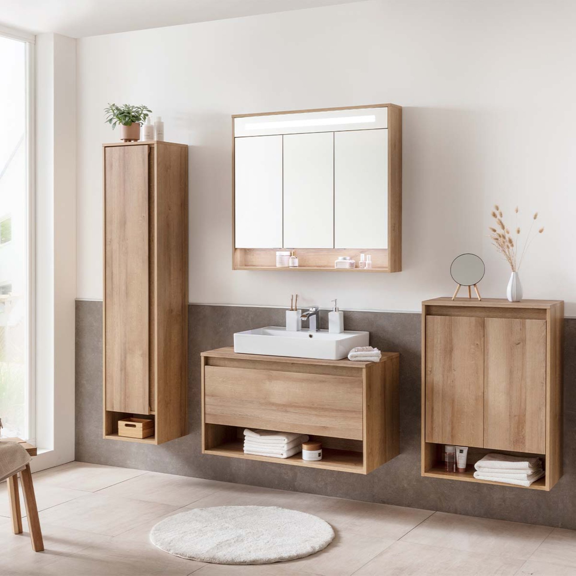 Mit dem 2-teiligen Set aus der Serie NATURA von Fackelmann schaffst Du Dir einen exklusiver Blickfang in Deinem Badezimmer. Damit liegst Du aktuell im Trend mit Strukturen und Farben aus der Natur. Grifflose Badmöbel lenken den Blick direkt auf das Design. Das Auge erfreut sich an der warmen hellbraunen Farbe der Front, die der Ast-Eiche nachempfunden ist. Der weiße Keramikwaschtisch mit seiner Breite von 61 cm erzeugt eine perfekte Harmonie. Auf Grund der Breite des Waschbeckens entsteht rechts und links Raum auf dem Waschtischunterschrank. Diesen kannst Du optimal als Ablagefläche nutzen. Zahnbürsten und Kosmetik finden hier ihren entsprechenden Platz und sind immer griffbereit. Die Großraumschublade des Unterschranks bietet ausreichend Stauraum für Badutensilien. Das offene Ablagefach im unteren Bereich des Waschbeckenunterschranks erlaubt einen schnellen Zugriff auf Dinge des täglichen Bedarfs. Hier kannst Du Handtücher, Fön oder Kosmetika verstauen. Mit viel Liebe zum Detail wird das Fackelmann NATURA Badmöbelset 2-teilig, Keramikbecken, 94 cm breit, Braun hell in Deutschland vormontiert und hergestellt. So ist es rasch in Deinem Badezimmer integriert.